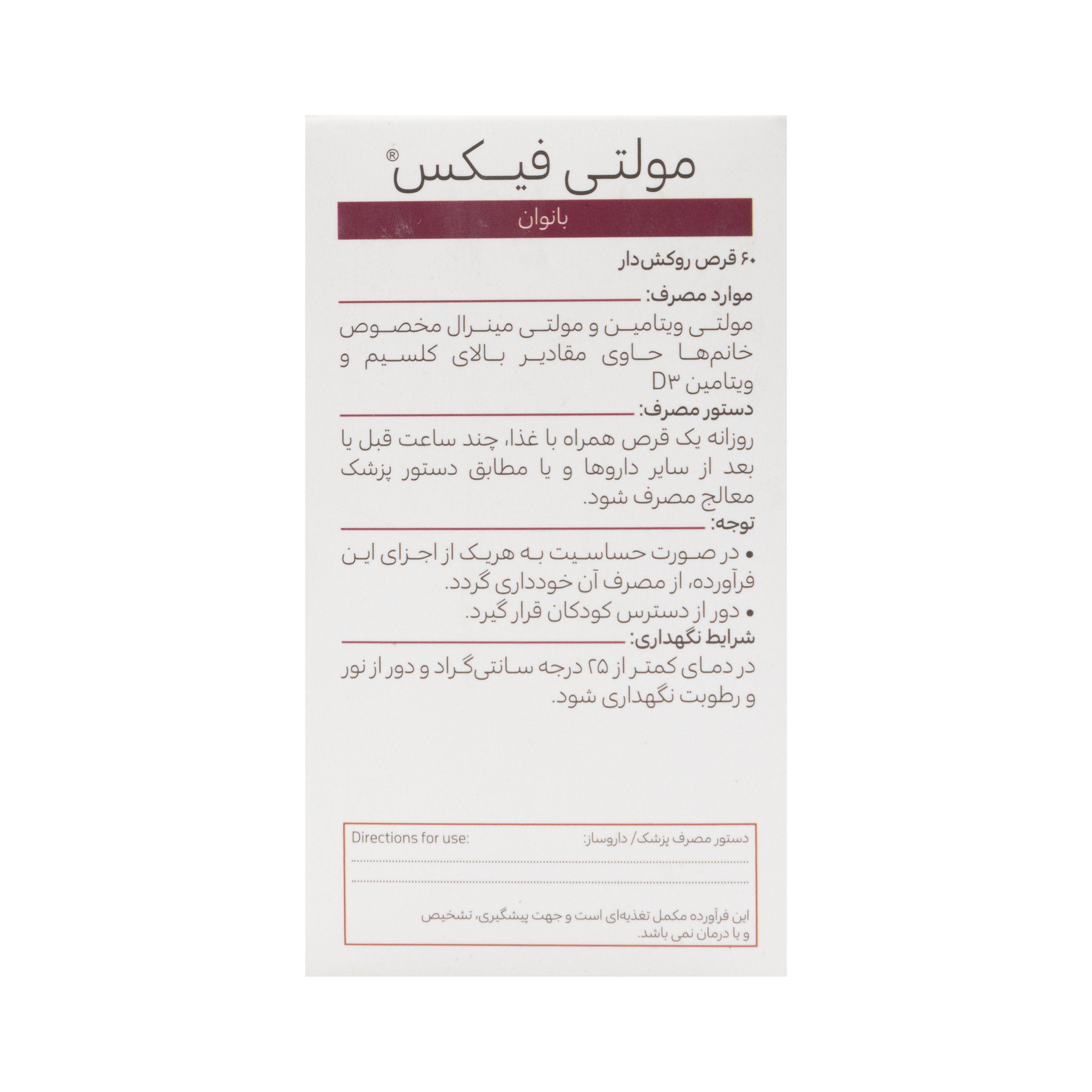- بدن بانوان باتوجه به شرایط خاص فیزیولوژیک و جسمی از نظر تأمین ویتامین با بدن آقایان متفاوت است. مولتی فیکس بانوان مکمل مخصوص بانوان می باشد که فرمولاسیون آن با توجه به نیازهای روزانه ی بانوان طراحی شده است.
