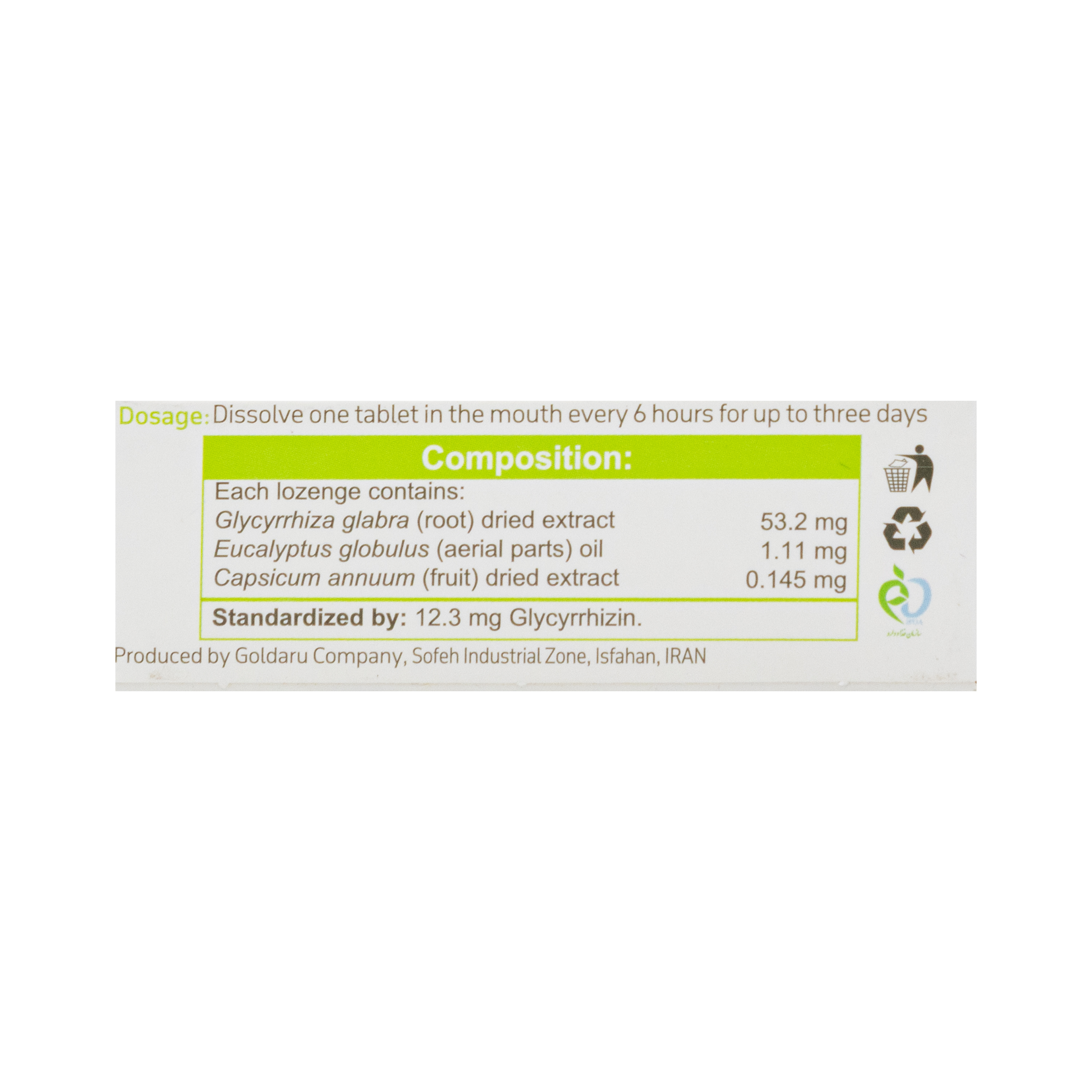 - عصاره خشک شیرین بیان 53.2 میلیگرم، اسانس اوکالیپتوس 1.11 میلیگرم، تنتور فلفل قرمز 0.145 میلی گرم