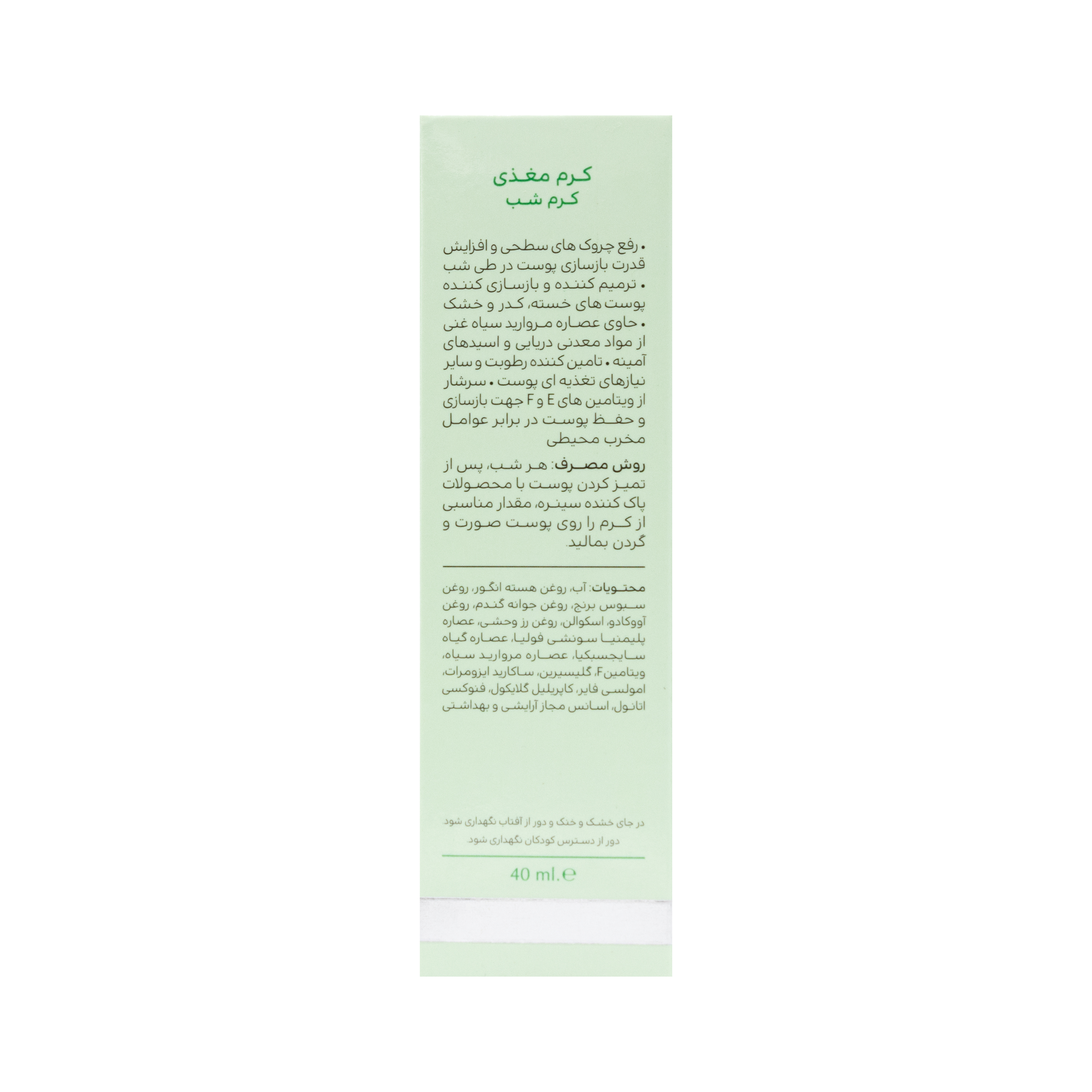 استفاده از کرم مغذی در شب به مرطوب شدن پوست، افزایش گردش خون و تحریک تولید کلاژن و الاستین کمک می کند که برای بازسازی و ترمیم پوست کمک می نماید.