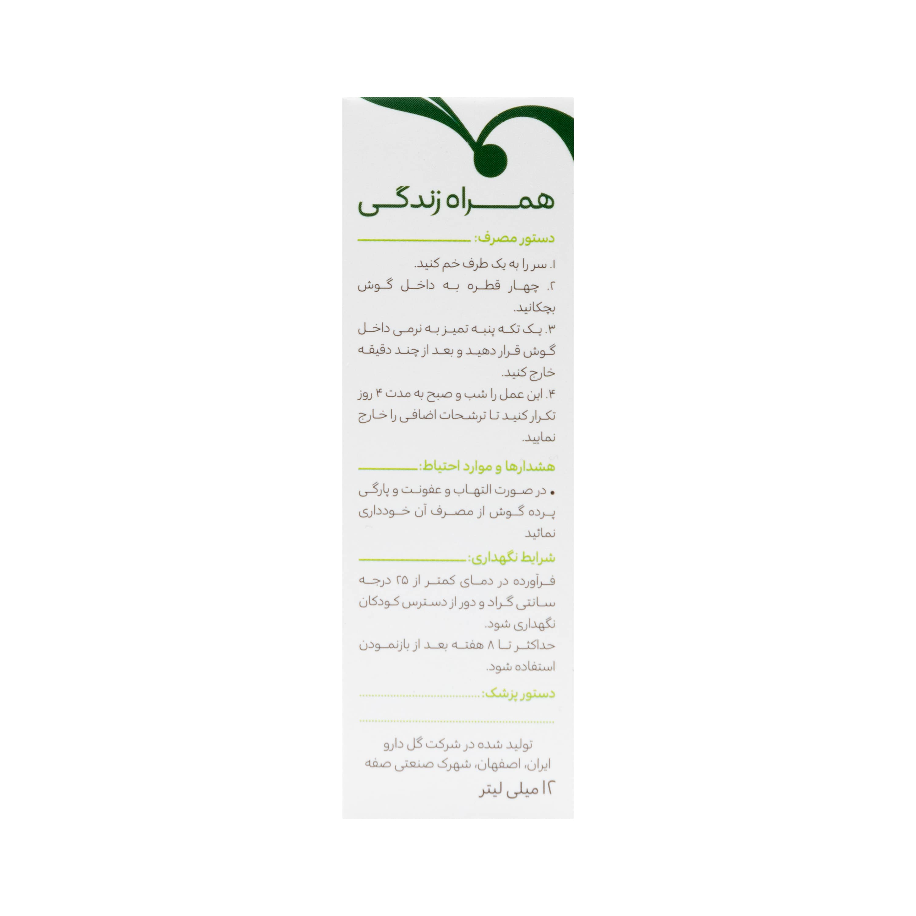- یا بعد از ۴ روز استفاده از قطره با مراجعه به پزشک و شستشوی گوش ترشحات اضافی را خارج نمائید.