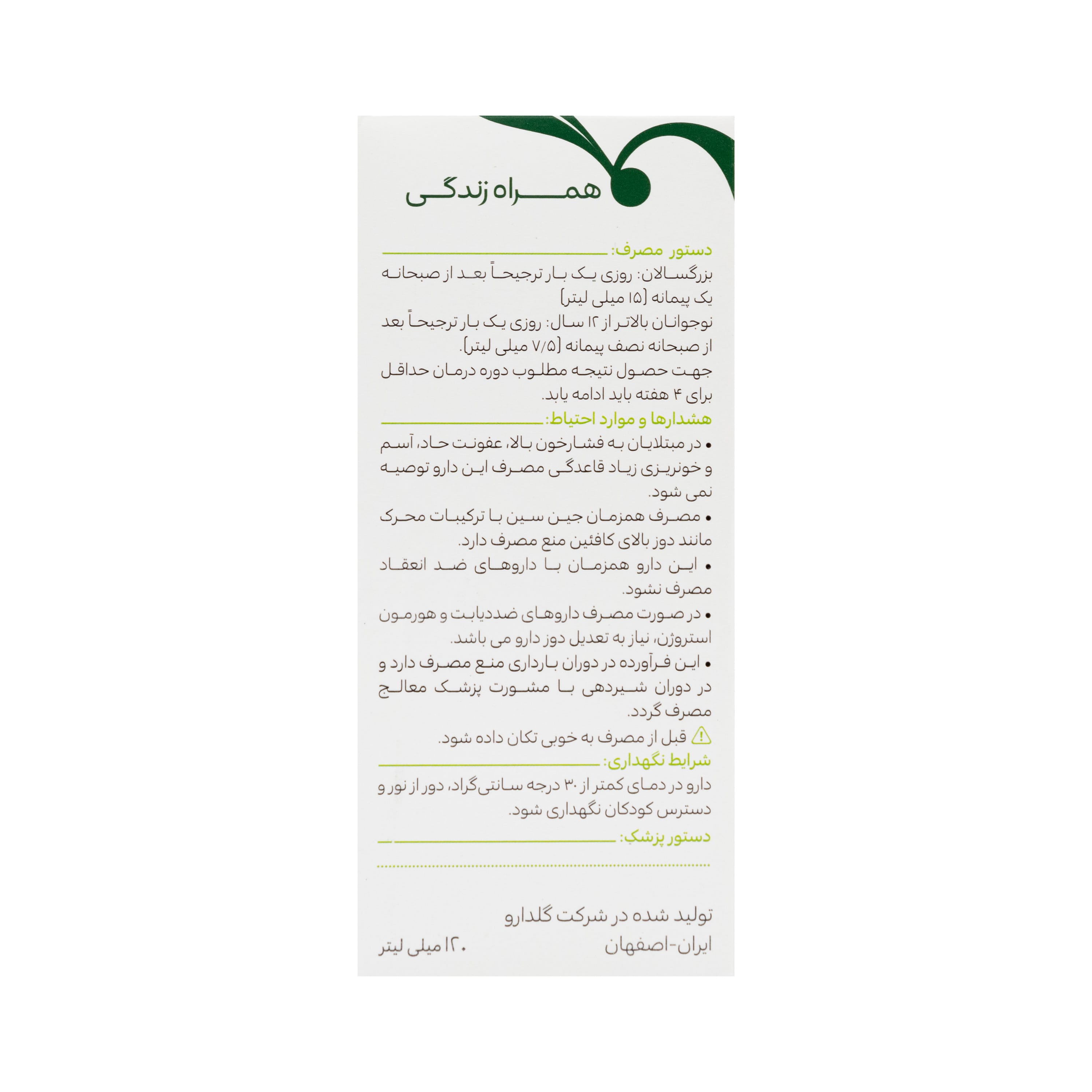 نحوه مصرف این دارو بدین صورت است که برای بزرگسالان روزانه یک پیمانه، در نوجوانان دو سوم پیمانه و در کودکان نصف پیمانه از این دارو ترجیحا صبح ها استفاده شود.دوره درمانی این دارو حداقل 4 هفته است. کسانی که دچار عفونت حاد یا آسم، فشار خون بالا یا خون ریزی زیاد در زمان قاعدگی هستند نباید از این دارو استفاده کنند. در صورت مصرف داروهای ضد انعقاد، از این دارو با احتیاط مصرف شود. اگر میزان استفاده از این دارو بیش از حد باشد ممکن است عوارضی مانند بی تابی، بی خوابی، اسهال، بی قراری، بالا رفتن فشار خون و بثورات جلدی را به همراه داشته باشد. در زمان مصرف این دارو از مصرف زیاد کافئین باید پرهیز گردد. بانوان باردار در سه ماهه اول بارداری نباید از این دارو استفاده کنند. مصرف این شربت برای بانوان شیرده منعی ندارد.