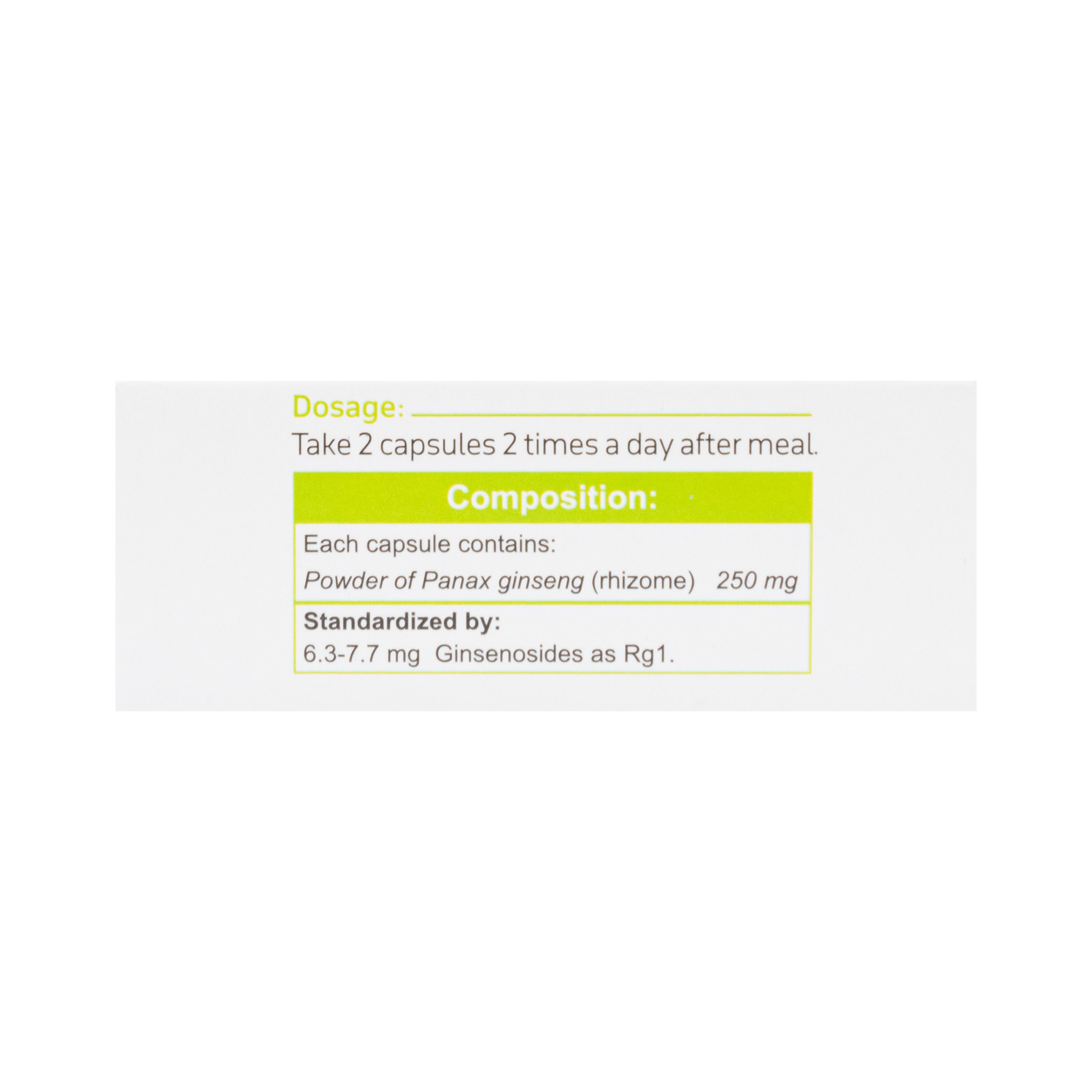 Standardized by: 6.3-7.7 mg Ginsenosides as Rg1 |