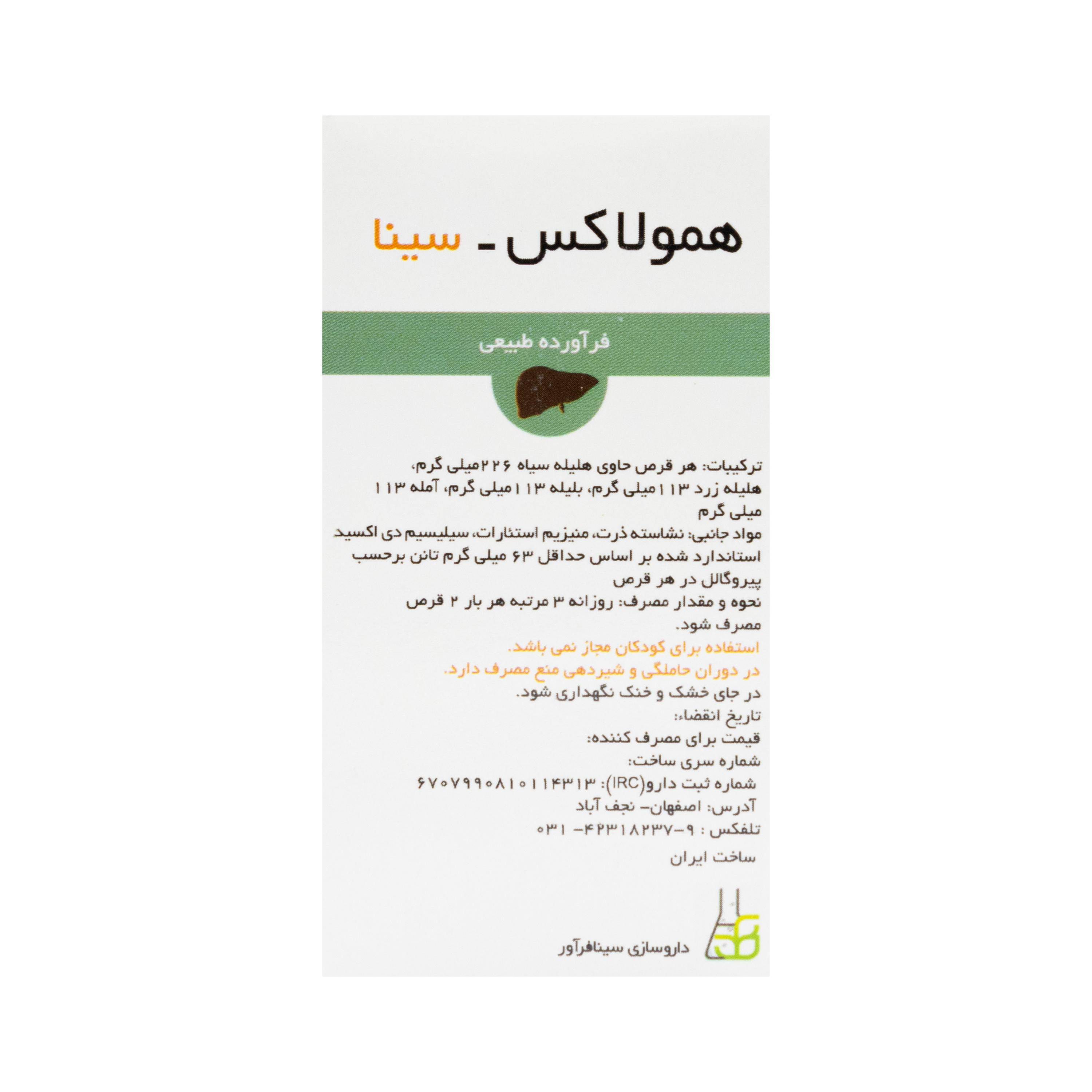 قرص همولاکس در شرکت سینا فرآور تولید شده و شامل آمله، بلیله و هلیله میباشد. همولاکس اثرات بینظیری در پاکسازی کبد، بهبود حرکات روده و دستگاه گوارش دارد و باعث رفع خستگی میشود.