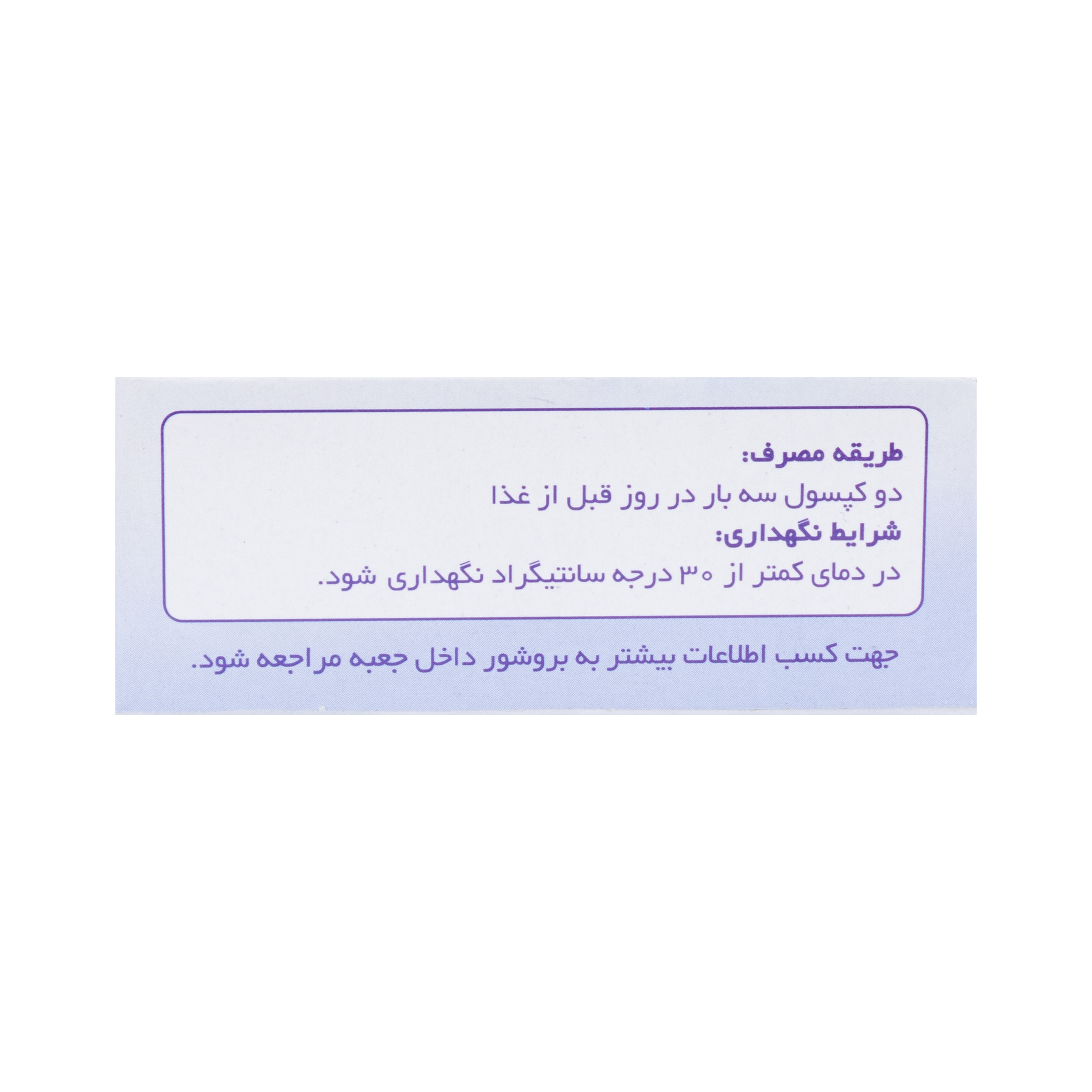 نحوه مصرف: | روزانه 3 نوبت و در هر نوبت 2 کپسول قبل از غذا میل شود |