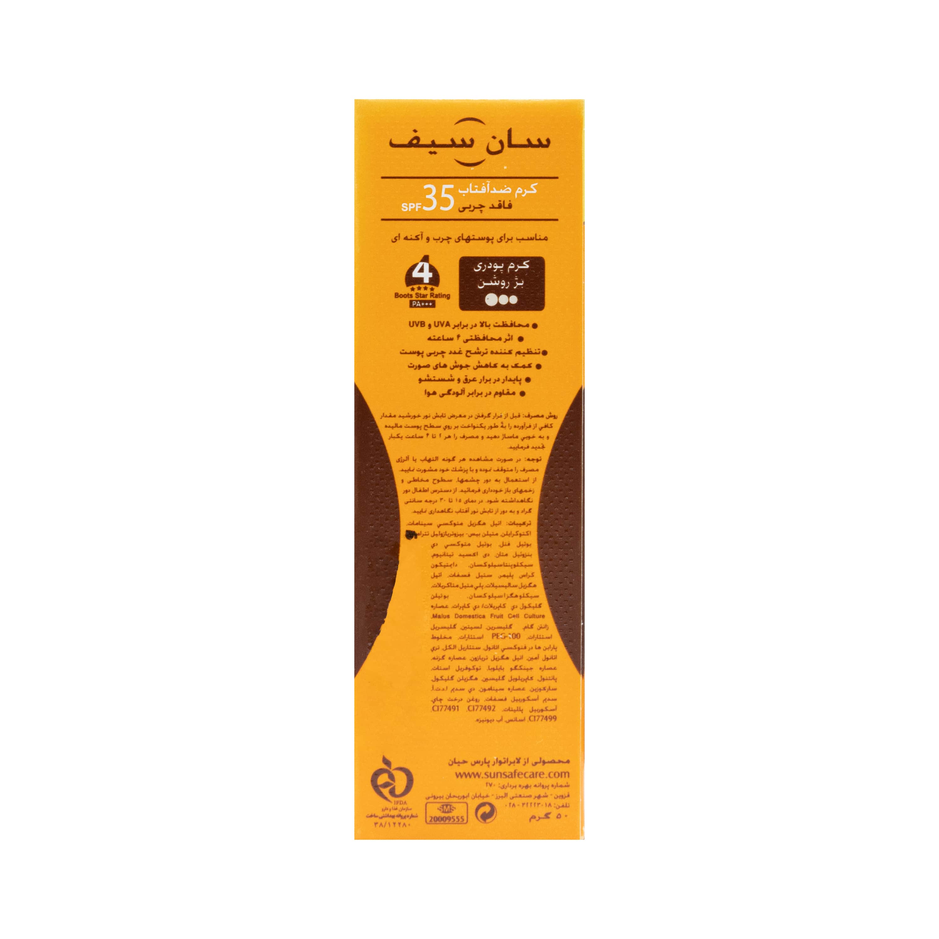 کرم ضد آفتاب SPF35 رنگی سان سیف فاقد چربی (Oil Free) بوده و ترکیبات موثر آن غیر کومدون زا می باشند و با سازگاری بسیار زیاد با پوست سبب کاهش احتمال بروز آلرژی (Hypoallergenic) می شود. با دارا بودن ویژگی های سبورگولاتور و مات کنندگی، میزان ترشح سبوم را کنترل کرده و ظاهر براق پوست را از بین می برد. این کرم در برابر تعریق و شستشو با آب مقاوم بوده و با داشتن ترکیبات آنتی اکسیدانی موثر سبب کاهش آلودگی ها و عوامل نامطلوب جوی بر روی پوست می شود. کرم ضد آفتاب سان سیف دارای+++ PA در سیستم اندازه گیری بین المللی ژاپن و 4 ستاره در سیستم اندازه گیری Boots بوده و حفاظت بسیار بالایی را نیز در برابر اشعه UVA ایجاد می نماید.