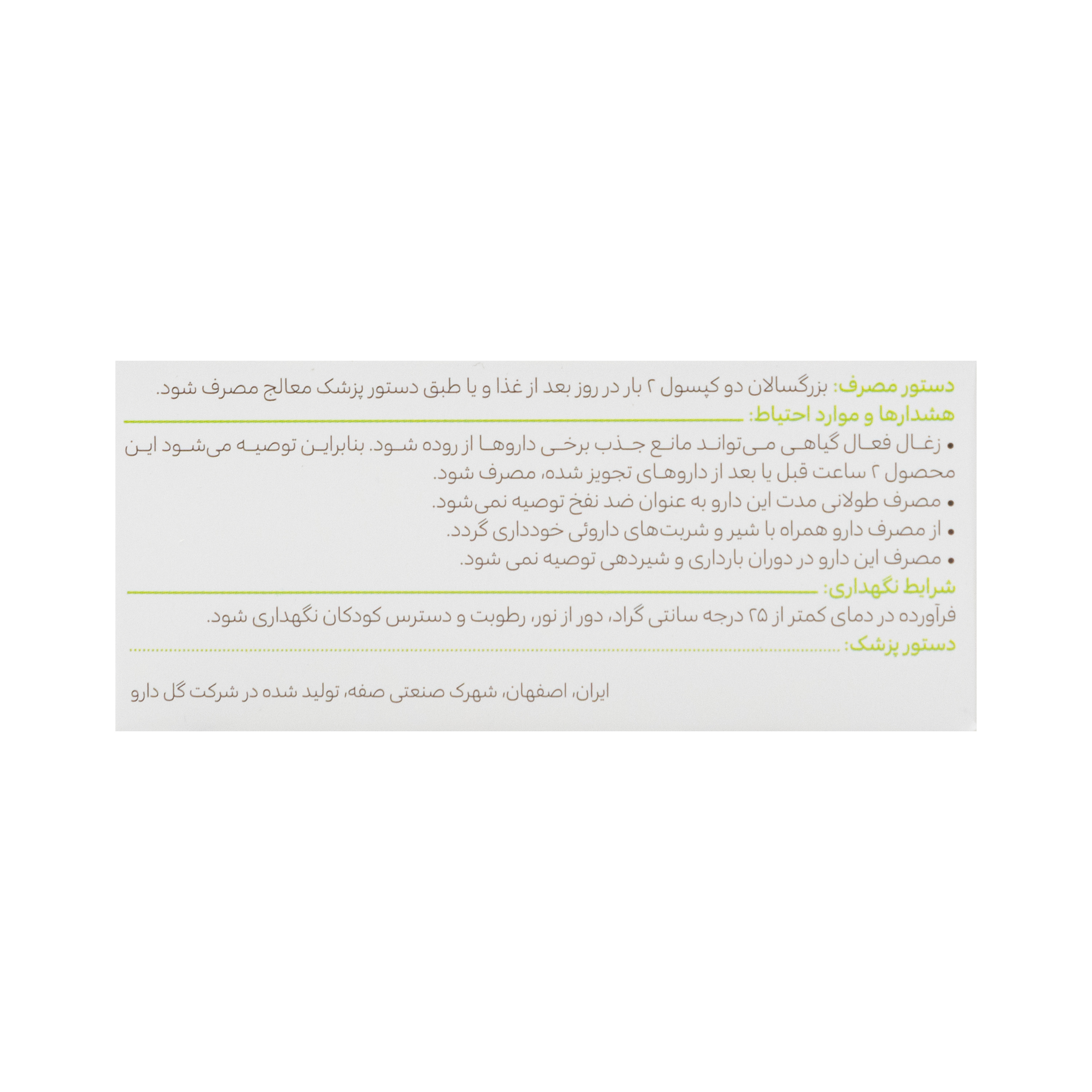 بزرگسالان دو کپسول ۲ بار در روز بعد از غذا و یا طبق دستور پزشک معالج مصرف شود.
