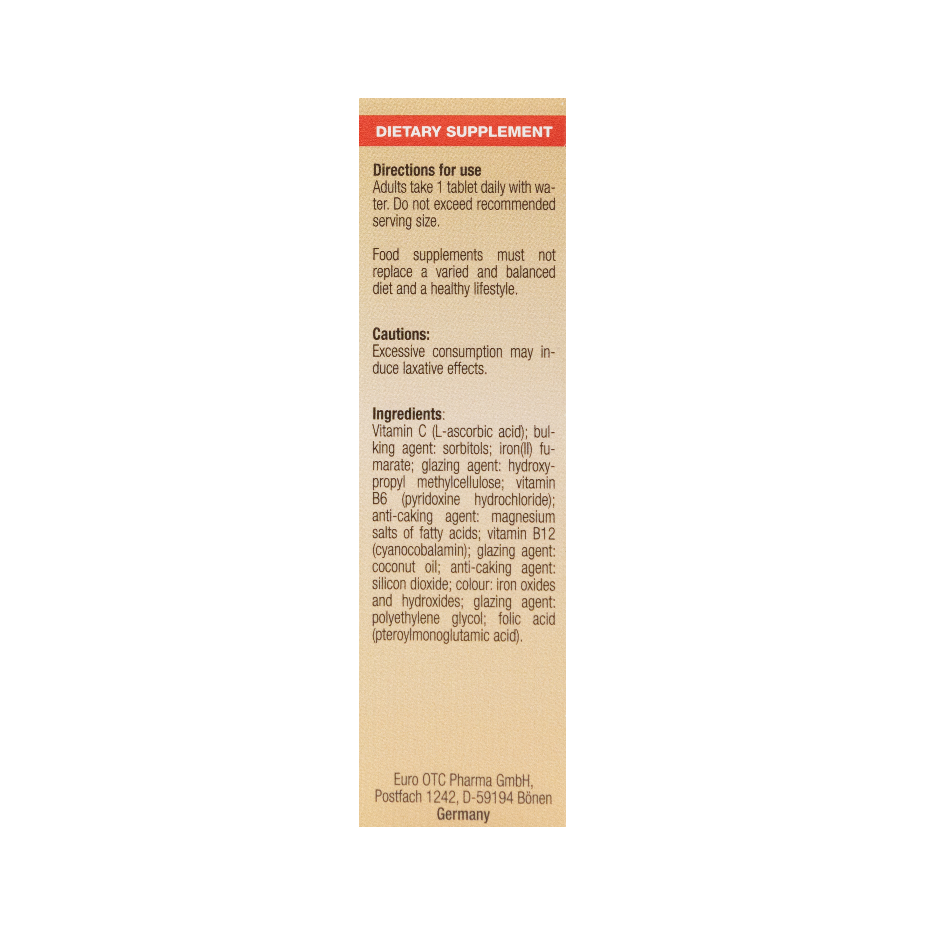 Ingredients: Vitamin C (L-ascorbic acid); bul- king agent: sorbitols; iron(II) fu- marate; glazing agent: hydroxy- propyl methylcellulose; vitamin B6 (pyridoxine hydrochloride); anti-caking agent: magnesium salts of fatty acids; vitamin B12 (cyanocobalamin); glazing agent: coconut oil; anti-caking agent: silicon dioxide; colour: iron oxides and hydroxides; glazing agent: polyethylene glycol; folic acid (pteroylmonoglutamic acid)