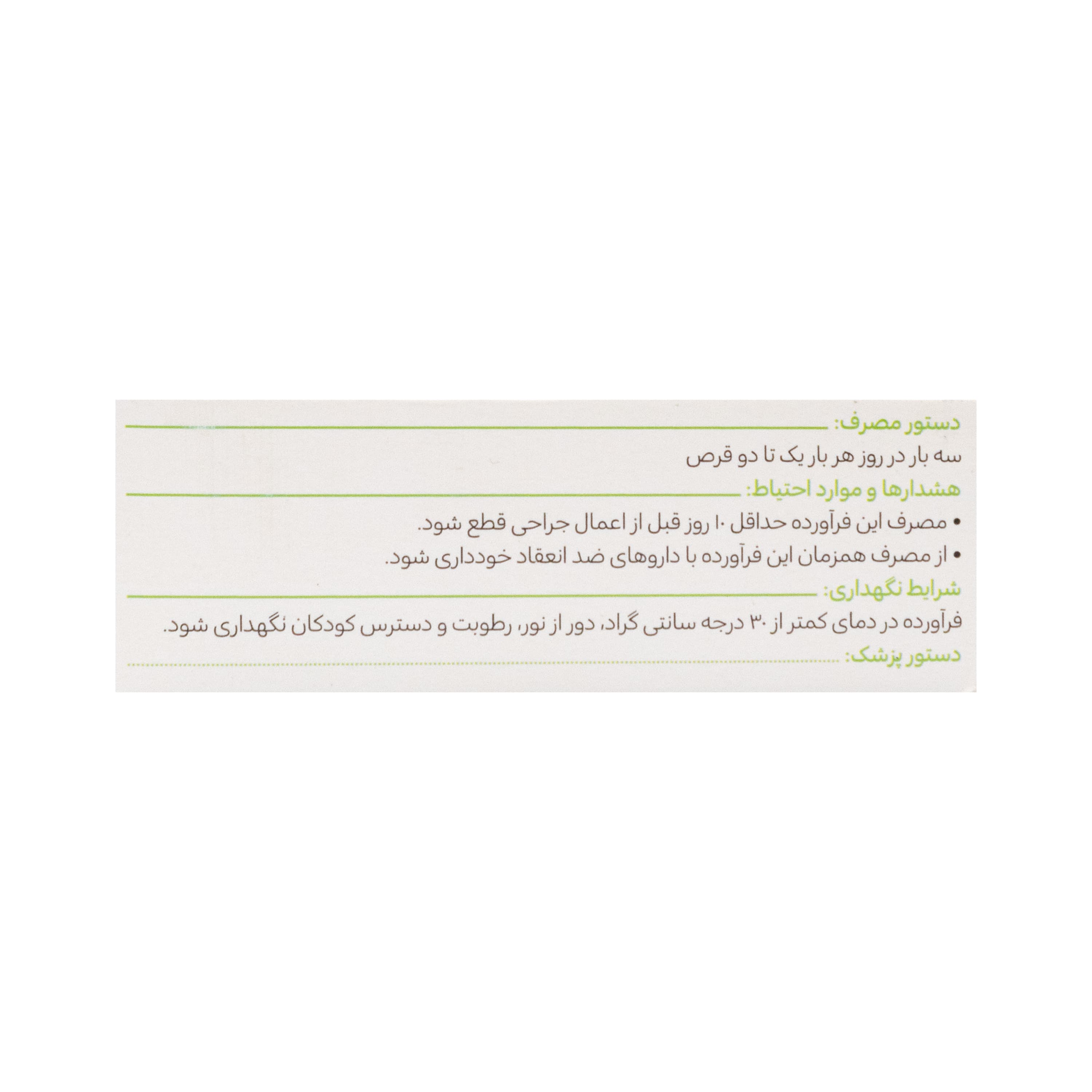- مصرف این فرآورده حداقل 10 روز قبل از اعمال جراحی قطع شود.