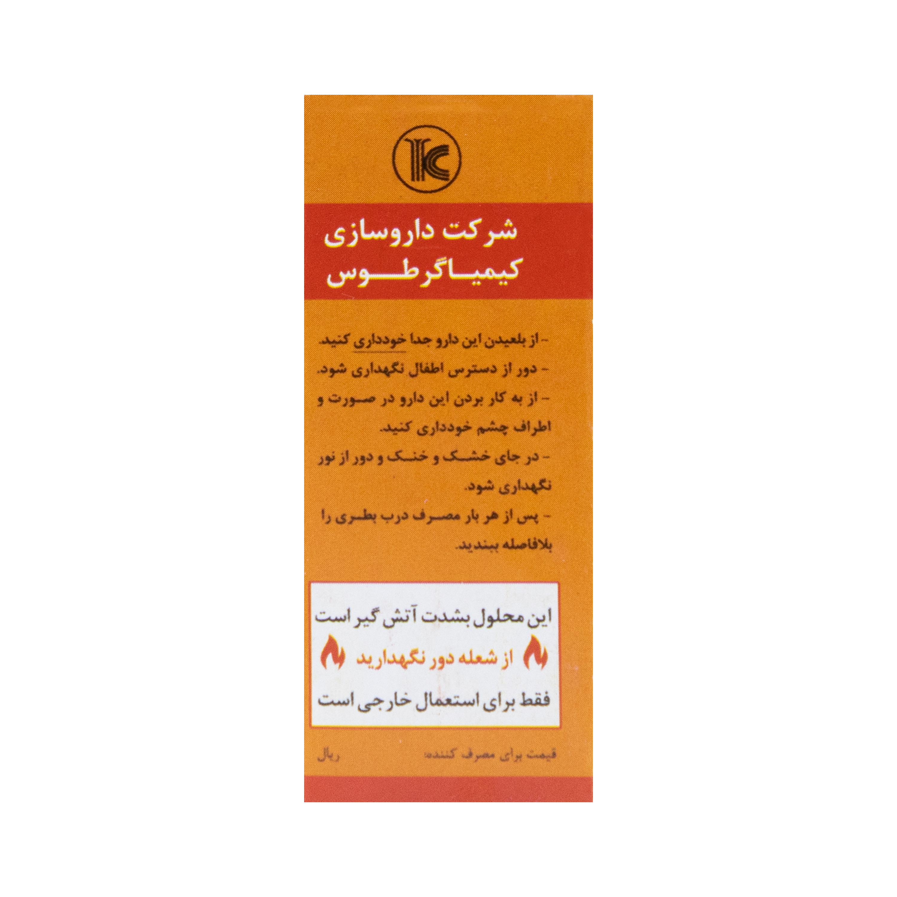 - این محلول به شدت آتشگیر و قابل انفجار است، لذا از شعله و حرارت مستقیم دور نگهدارید.