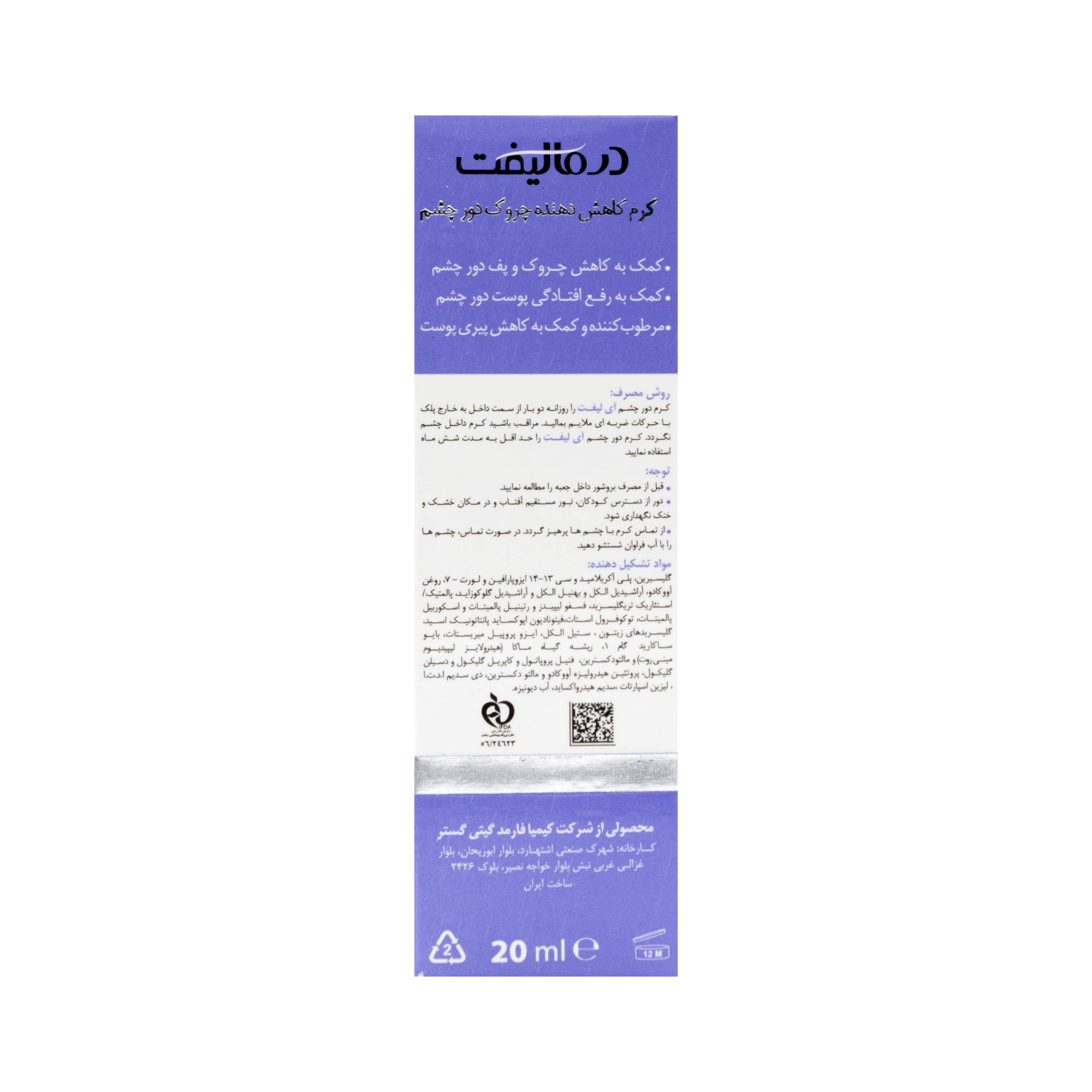 کرم ضد چروک و ضد پف دور چشم eyelift توسط شرکت ایرانی ژرف کوشافرین با نام تجاری درمالیفت روانه بازار گردیده و شما میتوانید این کرم با کیفیت را به راحتی از داروخانه اینترنتی مفید طب سفارش دهید و استفاده کنید.
