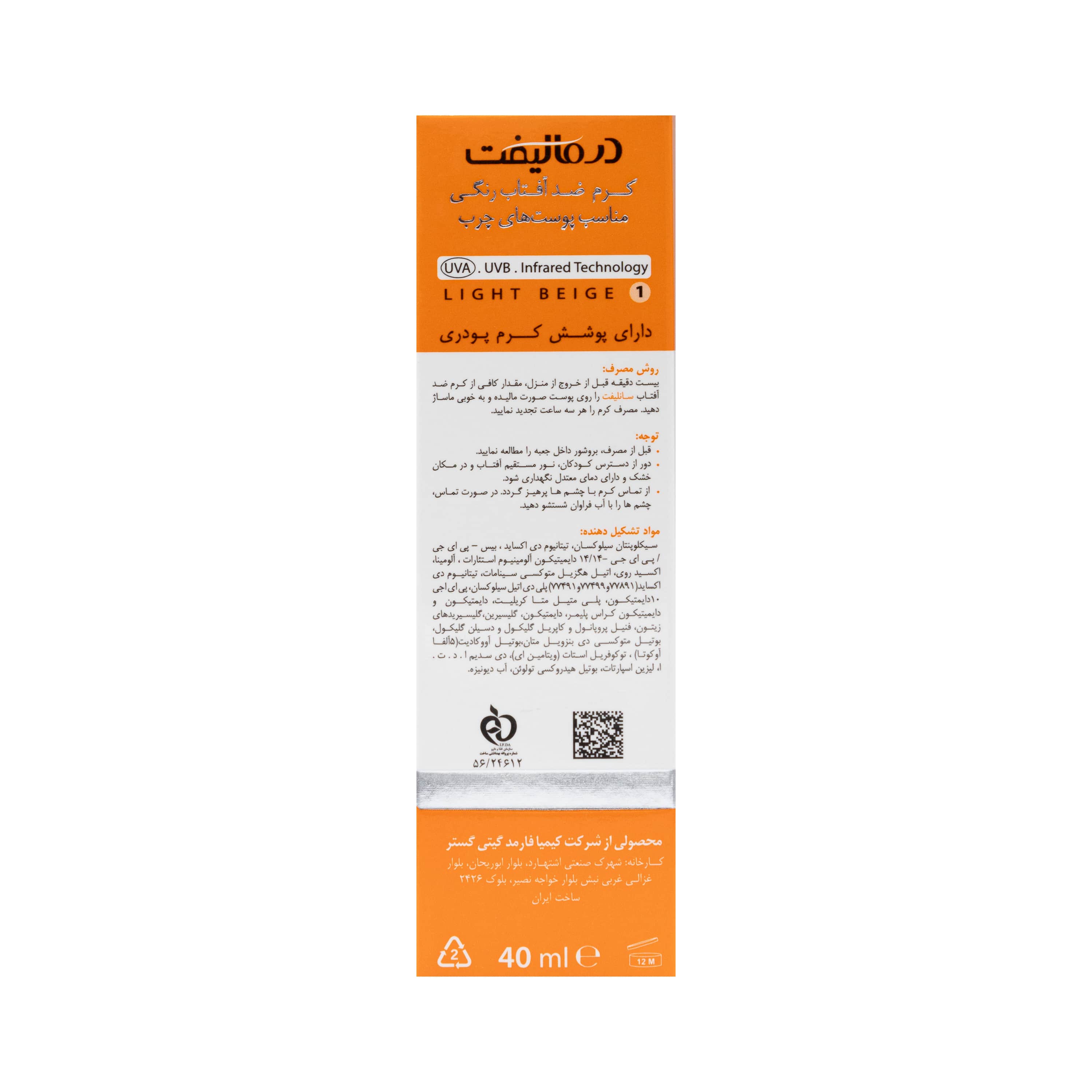 کرم ضد آفتاب رنگی بژ روشن پوست چرب درمالیفت با ایجاد یک لایه ی حفاظتی مناسب، از پوست در برابر تابش اشعه های مضر مثل فرانبفش و مادون قرمز محافظت می کند. SPF این کرم، 50 است و با کنترل تولید سبوم در پوست های چرب، رطوبت پوست را نیز حفظ می نماید.