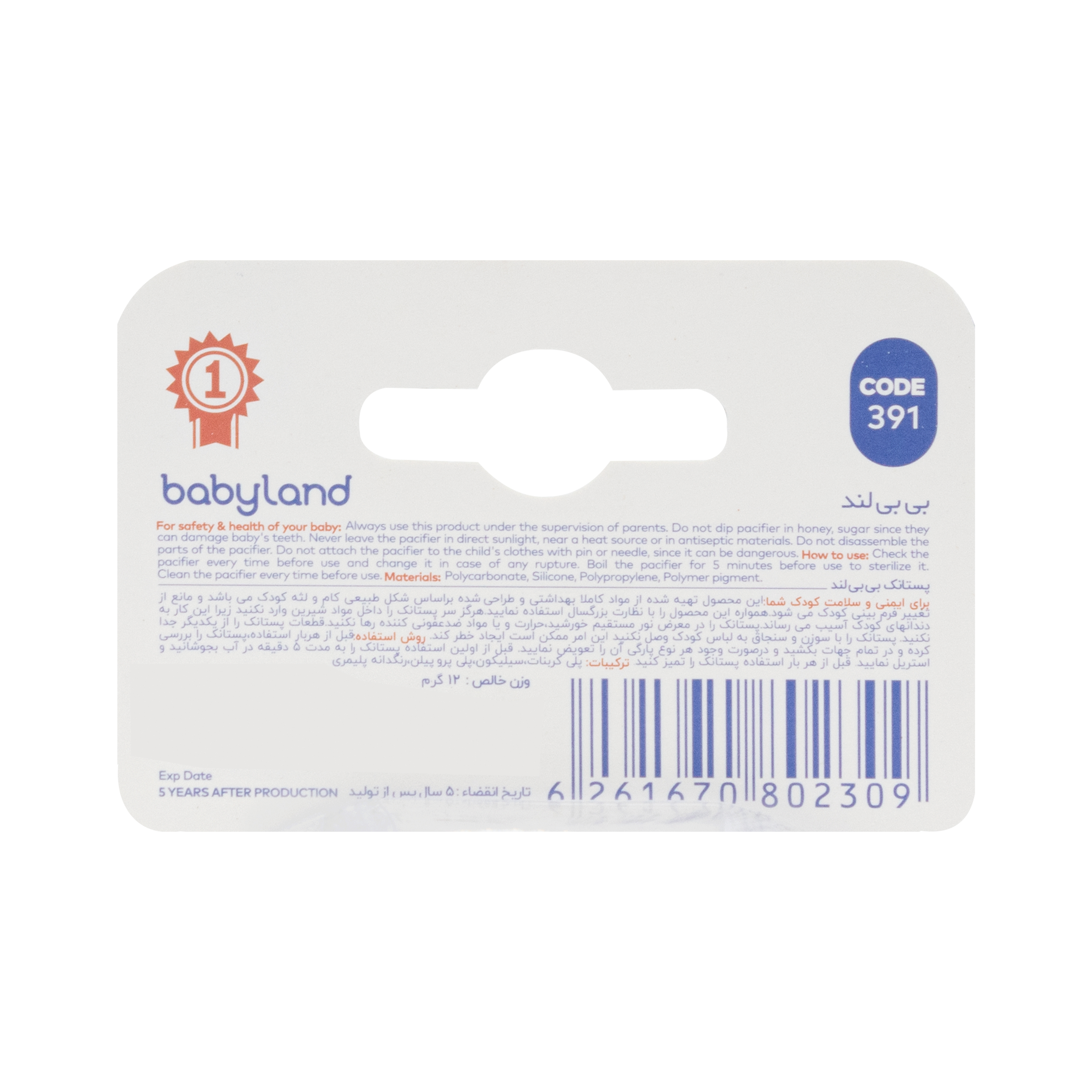 این محصول یک پستانک معمولی از برند «بیبی لند» است که در رنگ های متنوع موجود می باشد. این محصول تهیه شده از مواد کاملا بهداشتی و طراحی شده بر اساس شکل طبیعی کام و لثه کودک می باشد و مانع از تغییر فرم بینی کودک می گردد. یکی از ویژگی های این کار قابلیت استریل کردن آن است. مکیدن پستانک در خواب، از بیماری سندروم مرگ ناگهانی در خواب جلوگیری می کند.