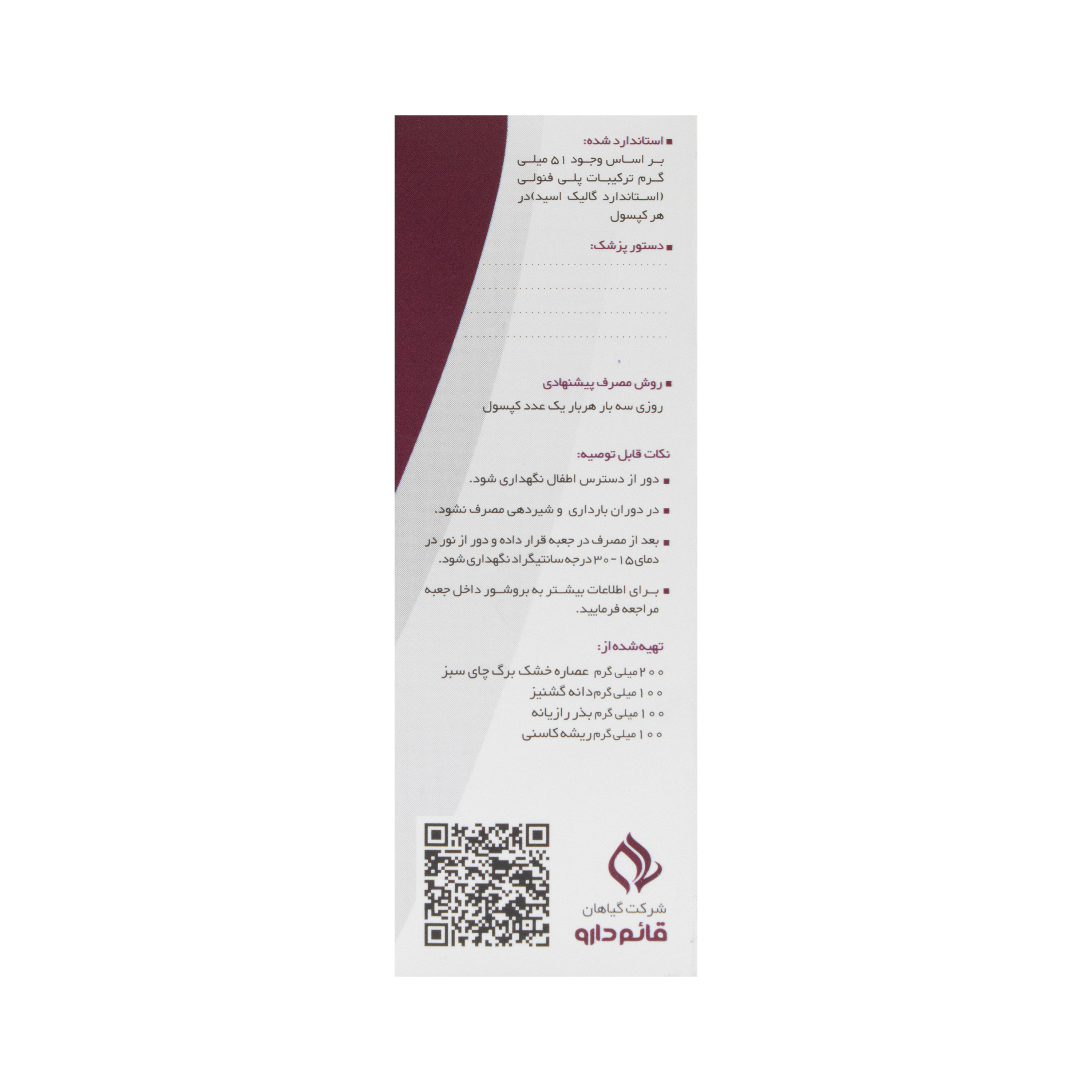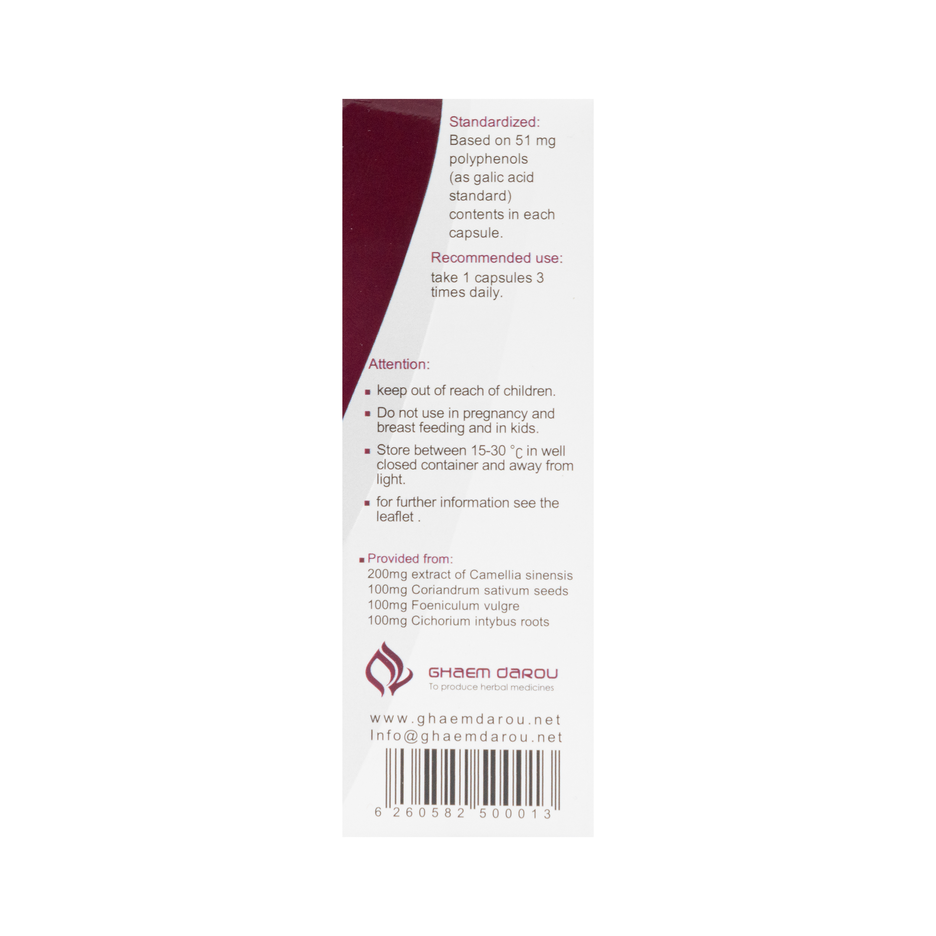 استاندارد شده براساس وجود 51 میلی گرم ترکیبات پلی فنولی (استاندارد گالیک اسید) در هر کپسول