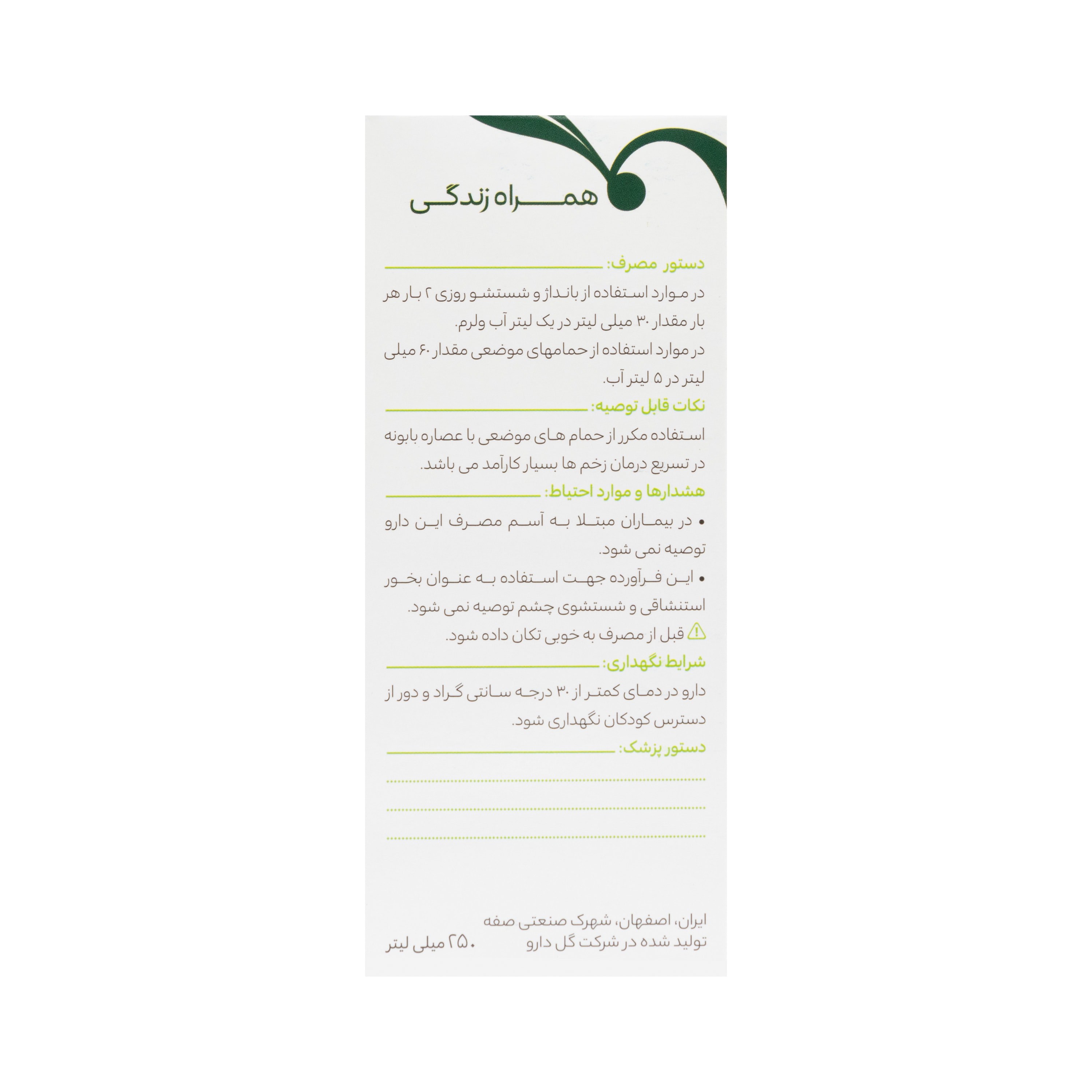 - در موارد استفاده از بانداژ و شستشو روزی ۲ بار هر بار مقدار ۳۰ میلی لیتر در یک لیتر آب ولرم