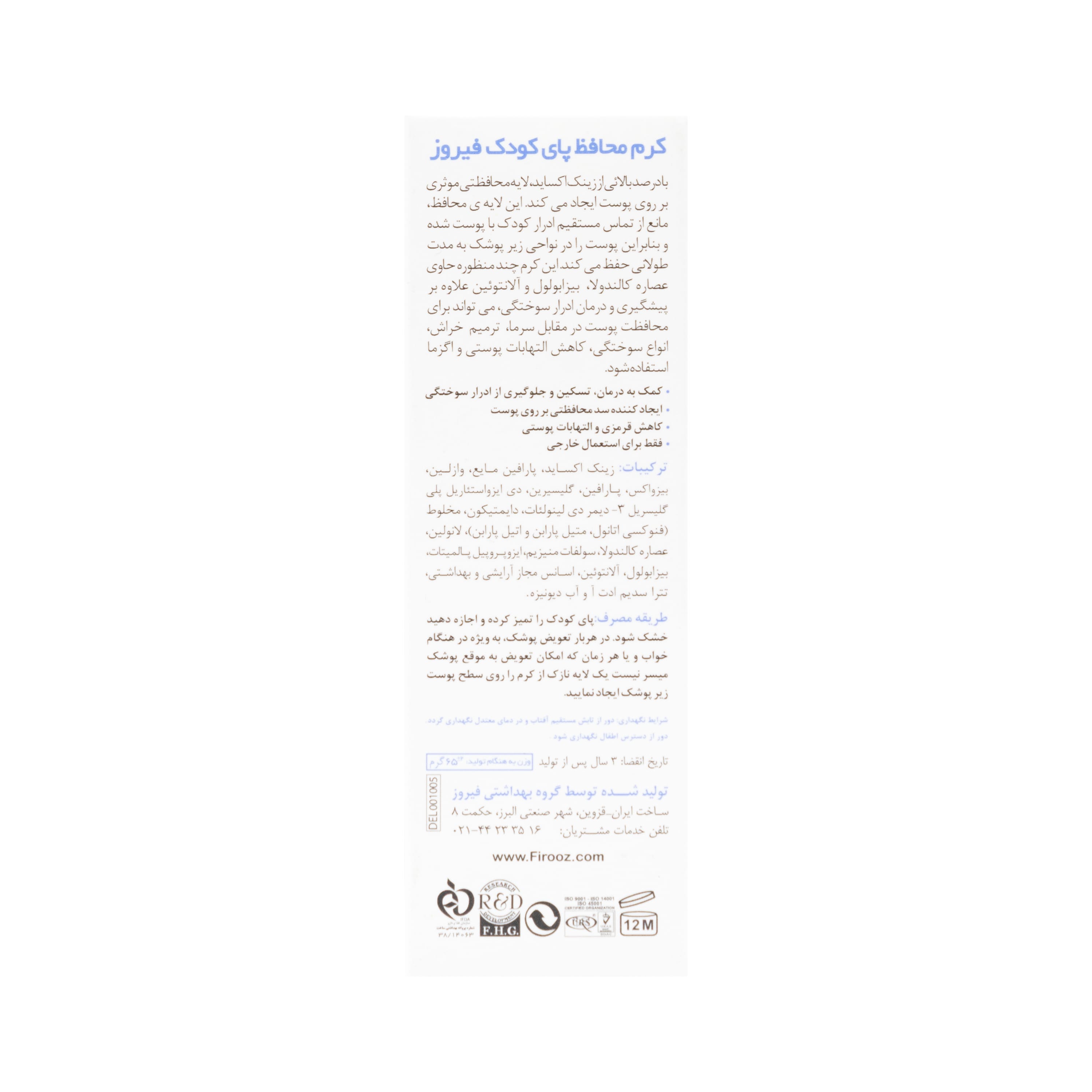 کرم محافظ پای کودک فیروز فاقد هرگونه پارابن، الکل و مواد رنگی ساخته شده است. کرم محافظ پای کودک فیروز با عصاره کالاندولا و 16% زینک اکساید پوست کودک را در برابر هرگونه التهاب ایمن کرده و با طرز ساده استفاده راحتی و آرامش را به شما و کودک عزیزتان هدیه خواهد نمود.