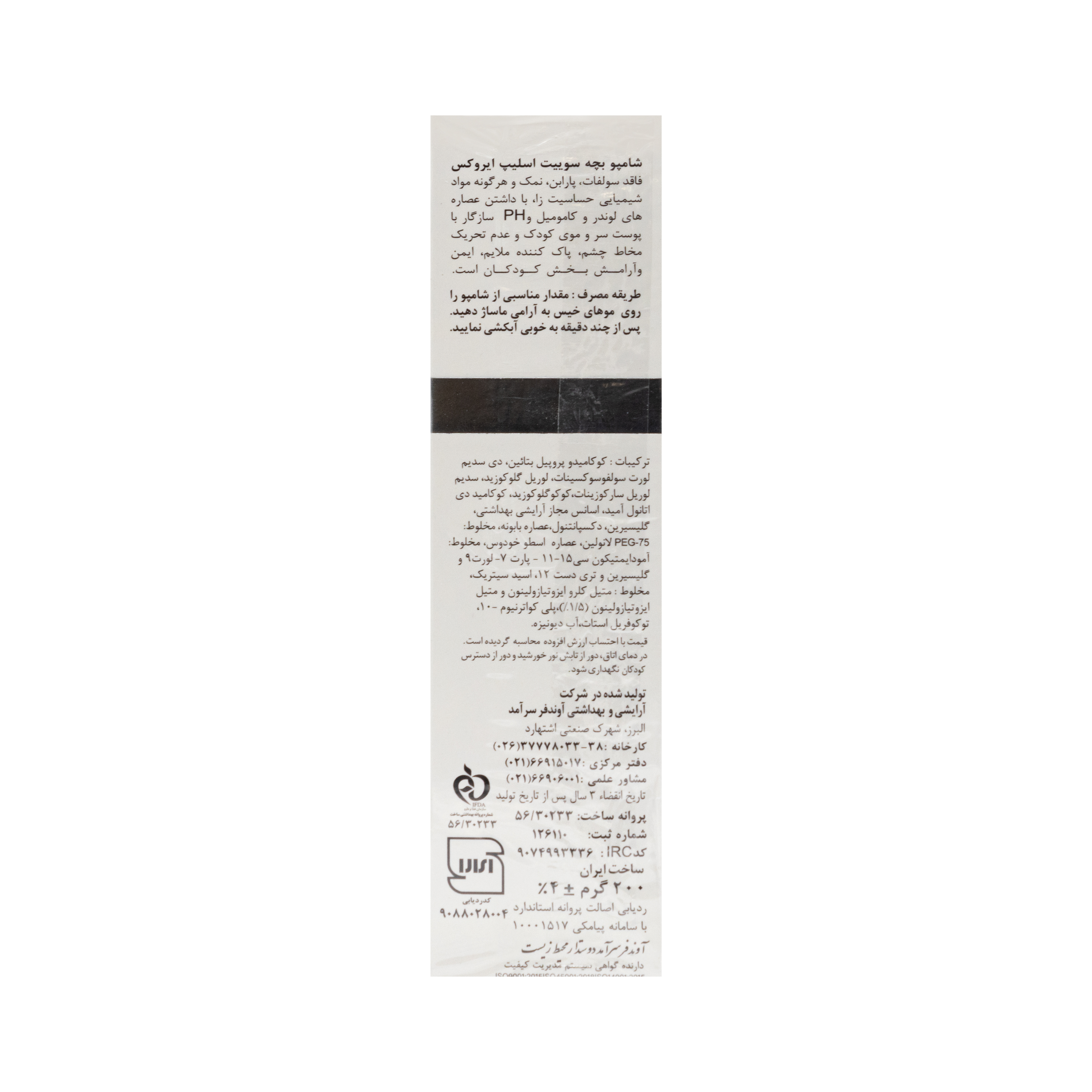 شامپو بچه سوییت اسلیپ ایروکس فاقد ،سولفات ،پارابن ،نمک و هرگونه مواد شیمیایی حساسیت ،زا با داشتن عصاره های لوندر و کامومیل و PH سازگار با پوست سر و موی کودک و عدم تحریک مخاط ،چشم پاک کننده ملایم ایمن و آرامش بخش کودکان است.