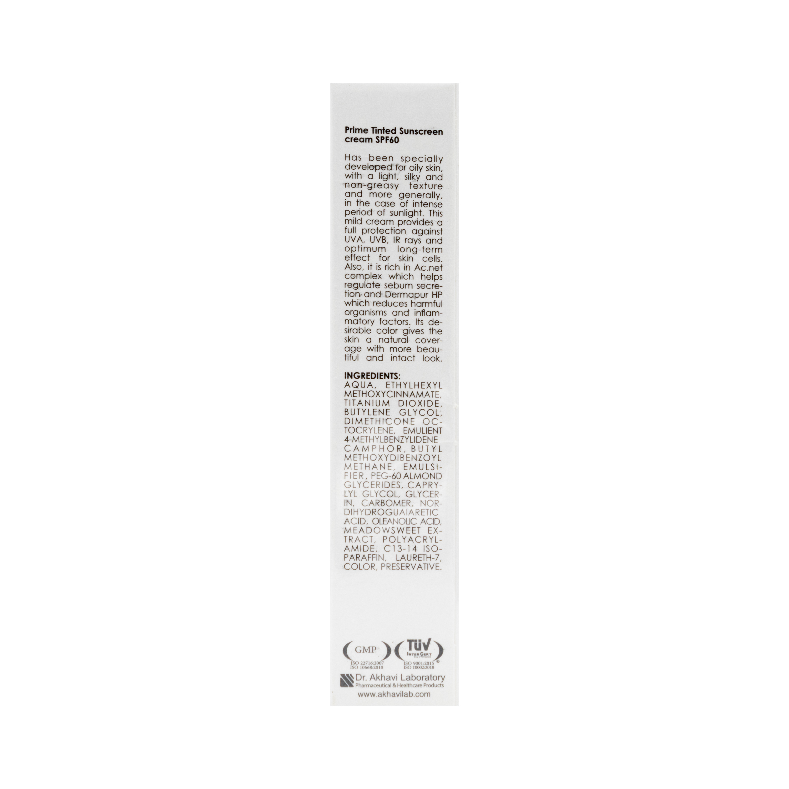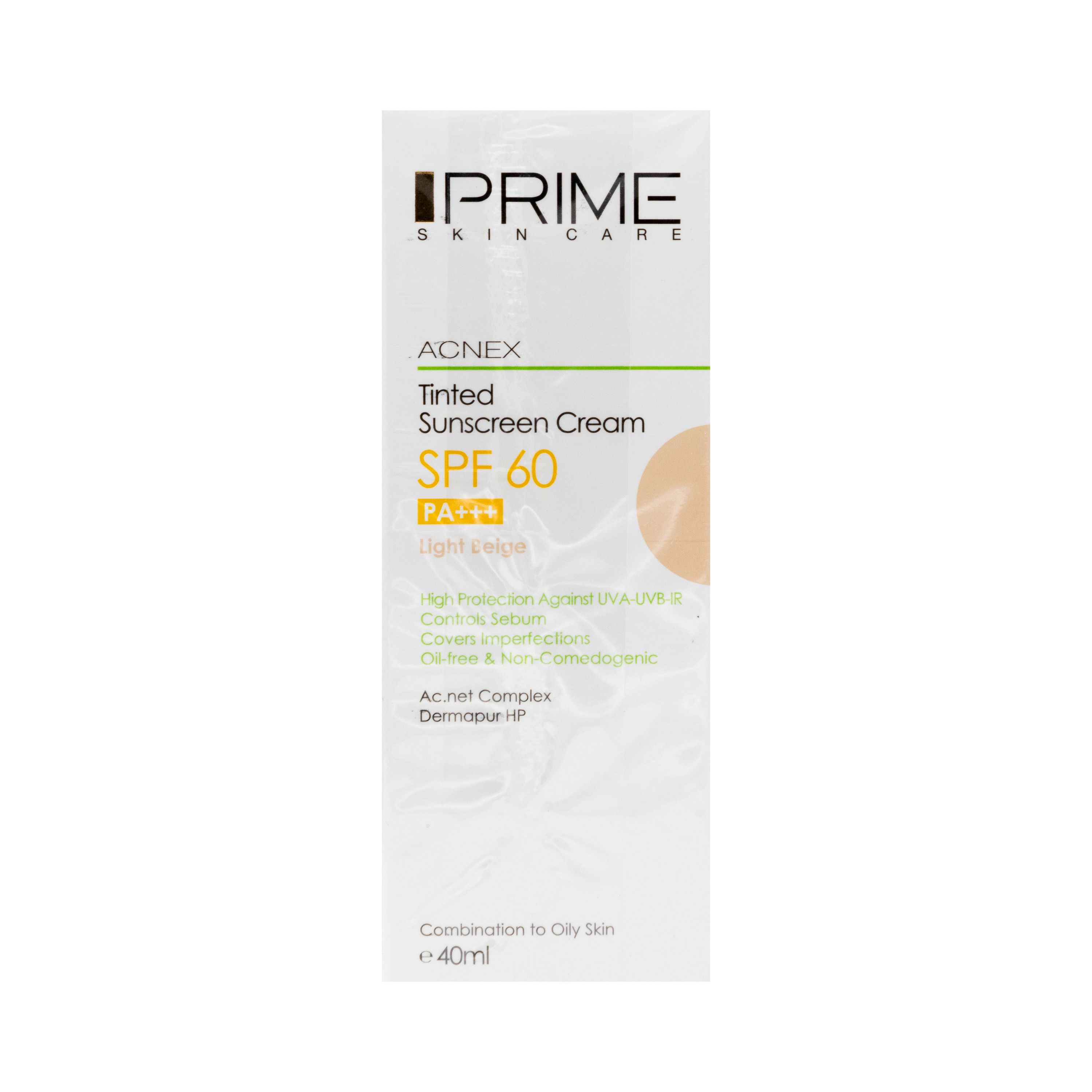 کرم ضد آفتاب رنگی فاقد چربی پریم SPF60 با بافتی سبک، ابریشمی و فاقد چربی جهت جلوگیری از اثرات زیانبار آفتاب تولید شده است. فیلترهای موثر این محصول ضمن حداکثر حفاظت از پوست در برابرUVB ، UVA و IR اثرگذاری طولانی نیز دارد. همچنین حاوی کمپلکس AC.NET و ترکیب Dermapur HP است که موجب شده خاصیت تنظیم ترشح پوست و ضد باکتری نیز داشته باشد. بنابراین این محصول از ایجاد و افزایش آکنه در پوست های چرب مستعد به آکنه نیز پیشگیری مینماید. این محصول عملکردی چندگانه با پوشش طبیعی داشته که علاوه بر حفاظت برتر در برابر آفتاب، کاهش چربی و براقیت پوست، همچنین پوشاندن لک های سطحی را نیز تامین مینماید.