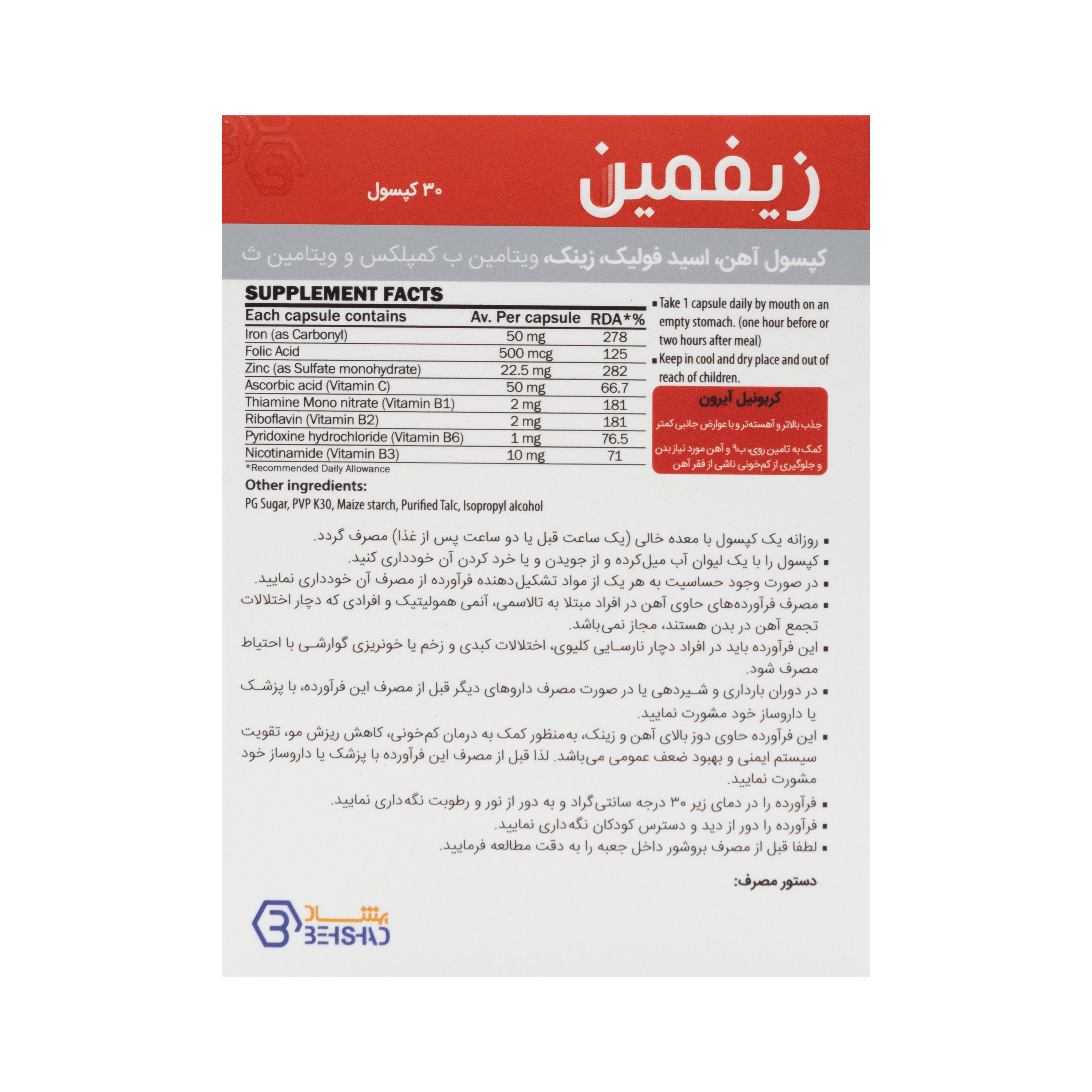 آهن موجود در زیفمین از نوع کربونیل می باشد که به علت جذب آهسته و تدریجی و متناسب با نیاز بدن، مانع تحریک گوارشی شده و علاوه بر جذب بالاتر و عوارض جانبی کمتر خطر ایجاد مسمومیت به حداقل می رسد. برای تامین ذخایر آهن بدن در افراد دچار کم خونی مصرف مکمل های آهن حداقل تا ۳ ماه باید ادامه پیدا کند.