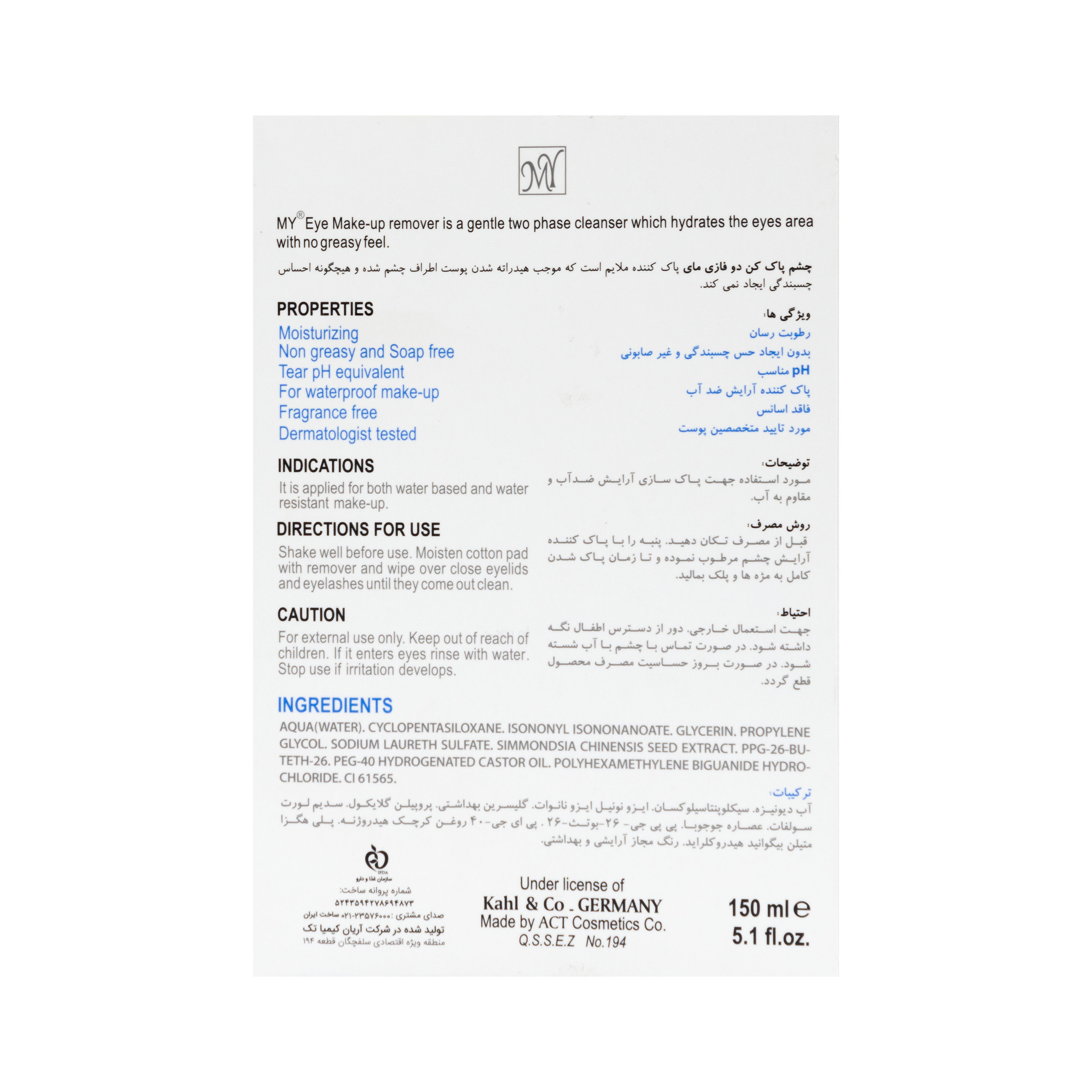 در آرایش پاک کن دو فازی مای از عصاره جوجوبا و روغن کستر برای دادن خواص مرطوب کنندگی و رساندن مواد مغذی به چشم استفاده شده است. در این محصول به هیچ وجه از مواد صابونی با pH بازی که باعث آسیب به پوست صورت شما میشود، استفاده نشده است.