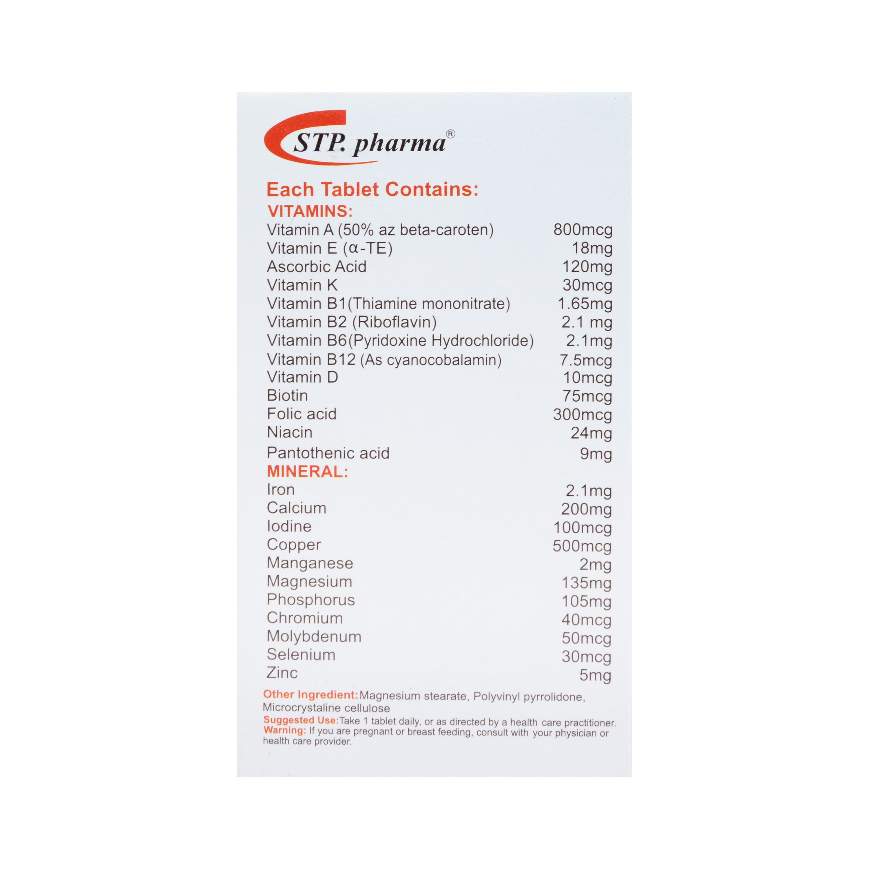 - با مصرف مولتی ویتامین STP Pharma سطح انرژی در بدن افزایش یافته و شادی و نشاط به وجود میآید. ویتامینهای موجود در این محصول کمک میکنند تا فرد بتواند دید بهتری داشته باشد. بهبود عملکرد قلب و عروق نیز از دیگر مزایای استفاده از این مولتی ویتامین است. ویتامینهای A ،E ،D و ویتامینهای گروه B از مهمترین ویتامینهای موجود در این مکمل غذایی هستند. از اصلیترین املاح معدنی موجود در این قرص نیز میتوان به آهن، کلسیم، منگنز و روی اشاره کرد.