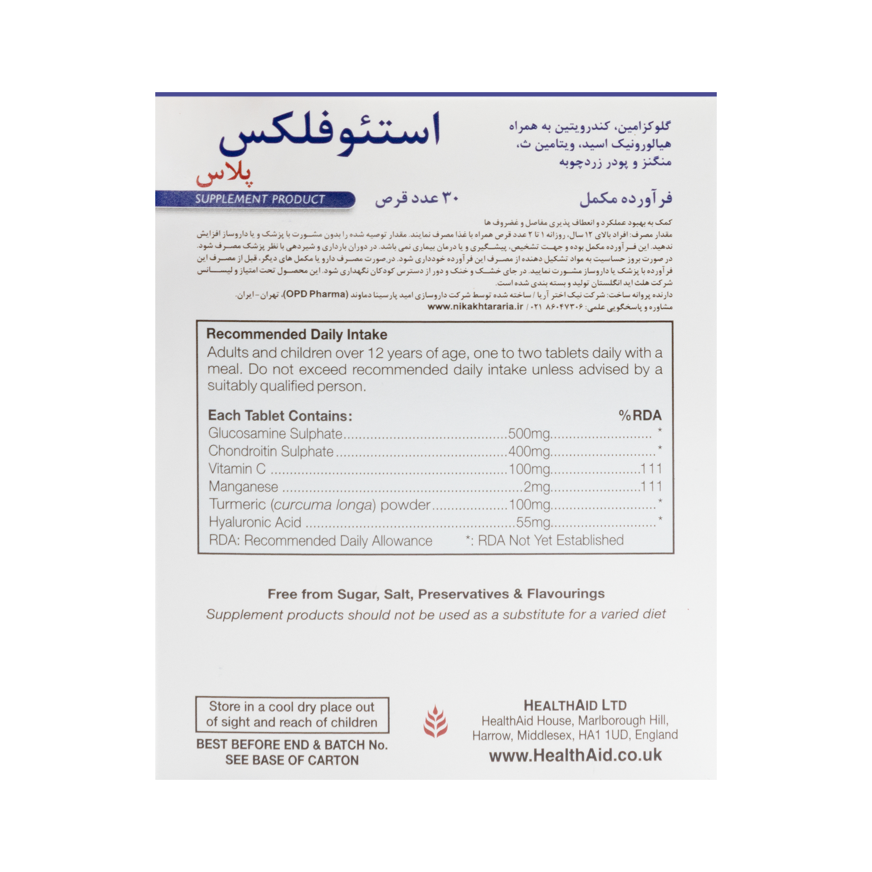 - قرص استئوفلکس پلاس هلث اید مواد مغذی لازم برای حمایت از مفاصل و غضروف ها را تامین می کند. قرص استئوفلکس پلاس یک ترکیب یکتا از هیالورونیک اسید، گلوکز آمین و کندرویتین سولفات با کیفیت می باشد که با همراهی ویتامین C، عصاره زردچوبه و منگنز به انعطاف پذیری و حرکت آسان مفاصل کمک کرده و باعث استحکام غضروف ها و سلامت استخوان ها می شود.
