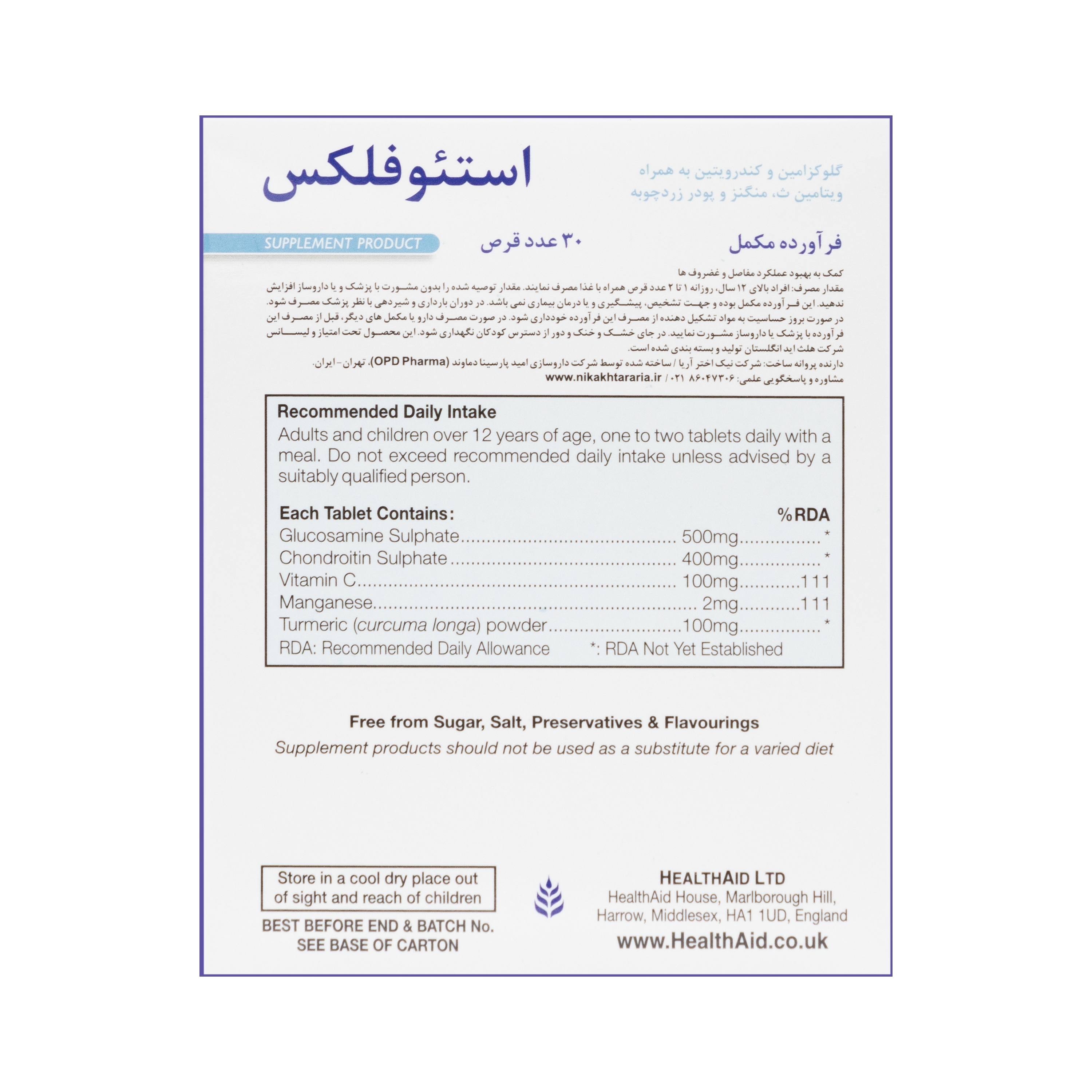 ترکیبی ممتاز و ویژه حاوی گلوکزآمین، کندروئیتین، ویتامین C، منگنز و زردچوبه است که برای کمک به حفظ نرمی و انعطاف پذیری مفاصل، تقویت و بازسازی غضروف های آسیب دیده و سلامت استخوان ها فرموله شده است. این ترکیب منحصر به فرد آهسته رهش (Prolonged Release) است .آهسته رهش بودن استئوفلکس سبب شده که این ترکیب در پروسه طولانی تری در دستگاه گوارش باز شود و به این ترتیب عوارض گوارشی ناشی از ترکیبات آن به ویژه گلوکزآمین به حداقل برسد.
