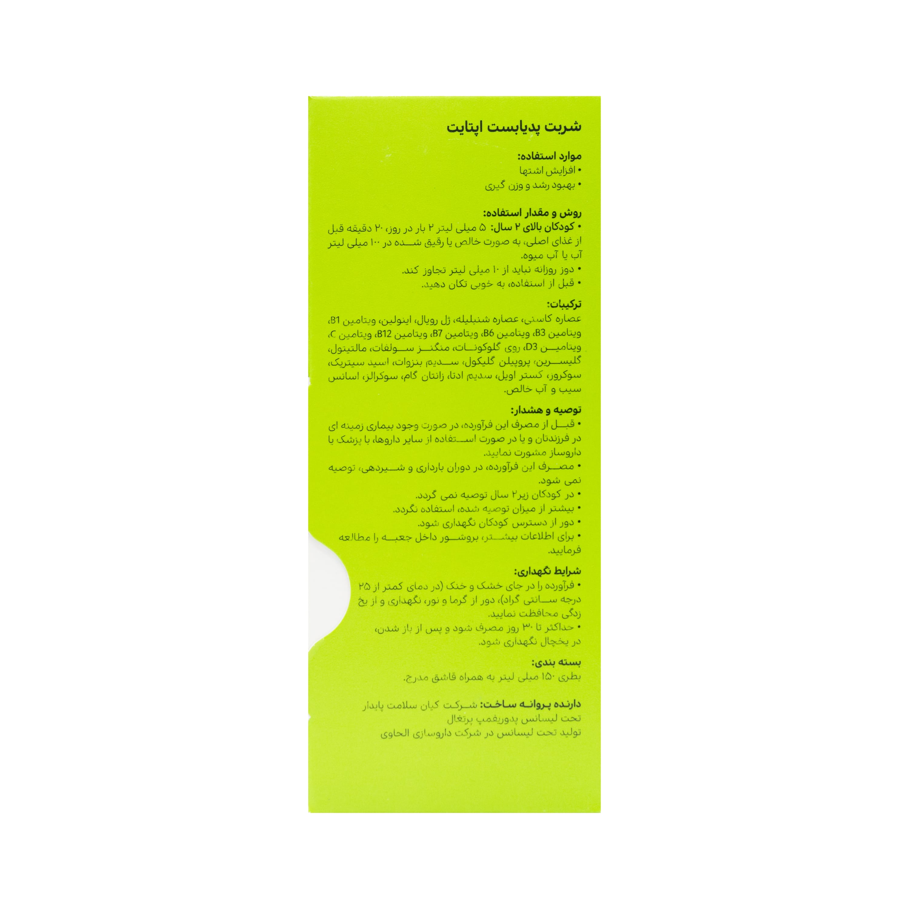 شربت پدیابست اپتایت یک شربت افزایشدهنده اشتهای خوش طعم است که به بهبود رشد و وزنگیری کودکان نیز کمک میکند. ژله رویال موجود در این شربت یک ترکیب بسیار مقوی است که ضعف بدن را کاهش داده و سیستم ایمنی را تقویت میکند. شربت پدیابست اپتایت همچنین حاوی عصاره کاسنی و شنبلیله است که به رفع مشکلات گوارشی کودک کمک میکند. این شربت همچنین حاوی ویتامینهای ضروری برای حفظ اشتها طبیعی بدن است. برای آشنایی بیشتر با این شربت اشتهاآور کودکان میتوانید ویدیو زیر را تماشا کنید: