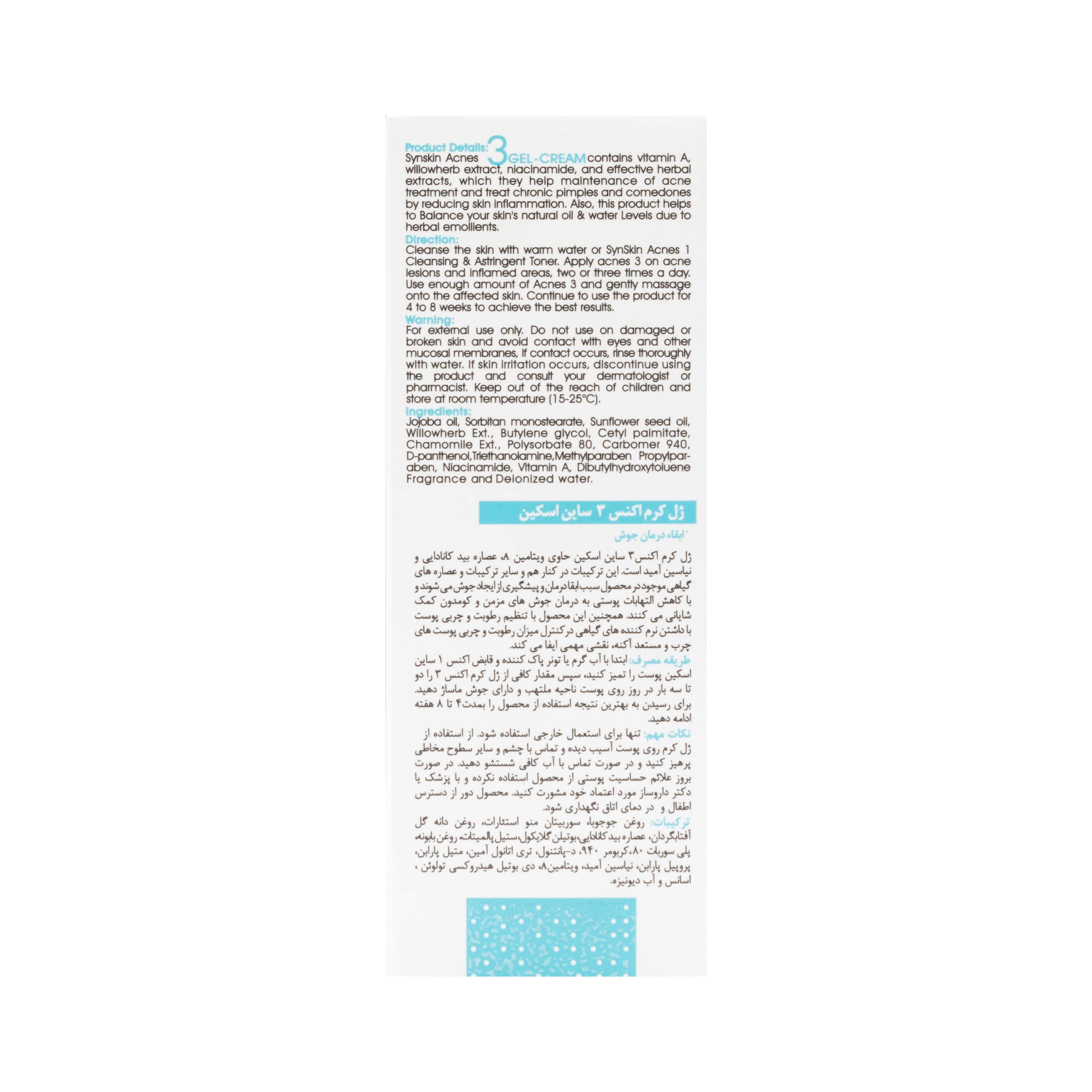 کرم ژل فاز مزمن اکنس ۳ ساین اسکین دارای بافتی سبک با جذب سریع بوده و حاوی ویتامین A، عصاره بید کانادایی و نیاسین آمید است. این ترکیبات در کنار هم و سایر ترکیبات و عصاره های گیاهی موجود در محصول باعث شده اند تا کرم ژل فاز مزمن اکنس ۳ در پیشگیری از ایجاد جوش و ابقا درمان های ضد جوش نقش مؤثری ایفا کند و همچنین با کاهش التهابات پوستی به درمان جوش های مزمن و کومدون کمک شایانی می کند. این محصول با تنظیم رطوبت و چربی پوست با داشتن نرم کننده های گیاهی نظیر روغن جوجوبا، روغن شاهدانه و پیش ساز ویتامین B5 در کنترل میزان رطوبت و چربی پوست های چرب و مستعد آکنه، نقشی مهمی ایفا می کند.