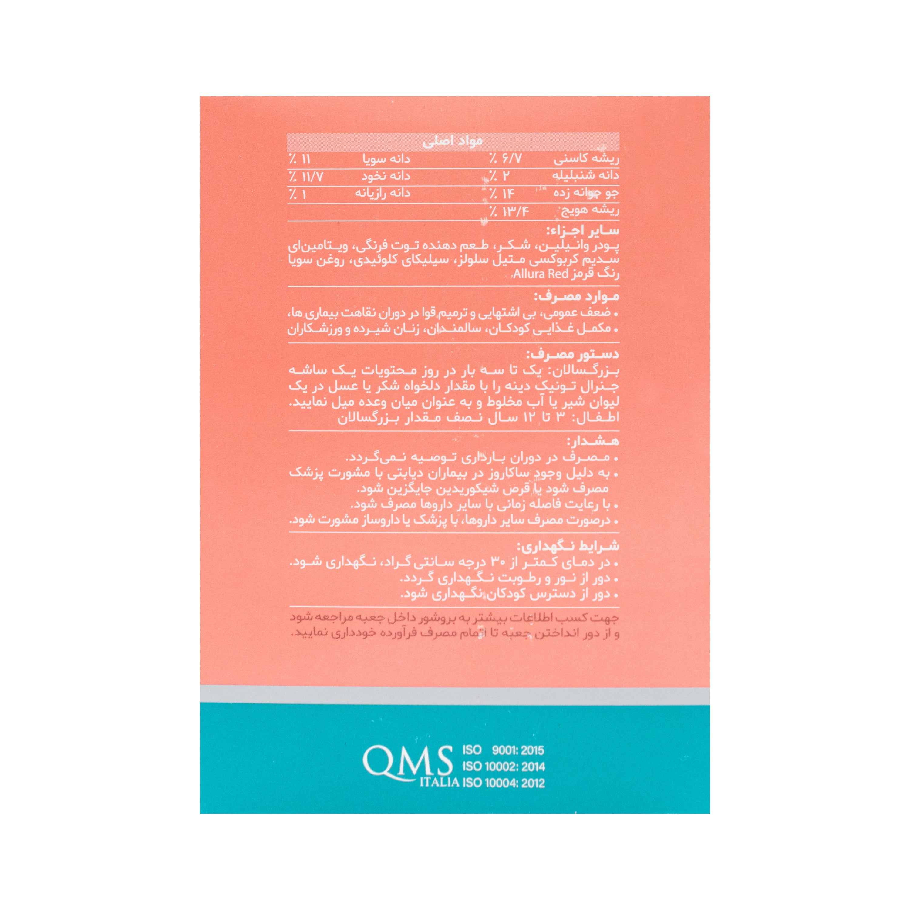 - پودر وانیلین ،شکر ،رنگ، طعم دهنده، ویتامین ای سدیم کربوکسی متیل سلولز، روغن سویا، سیلیکای کلوئیدی