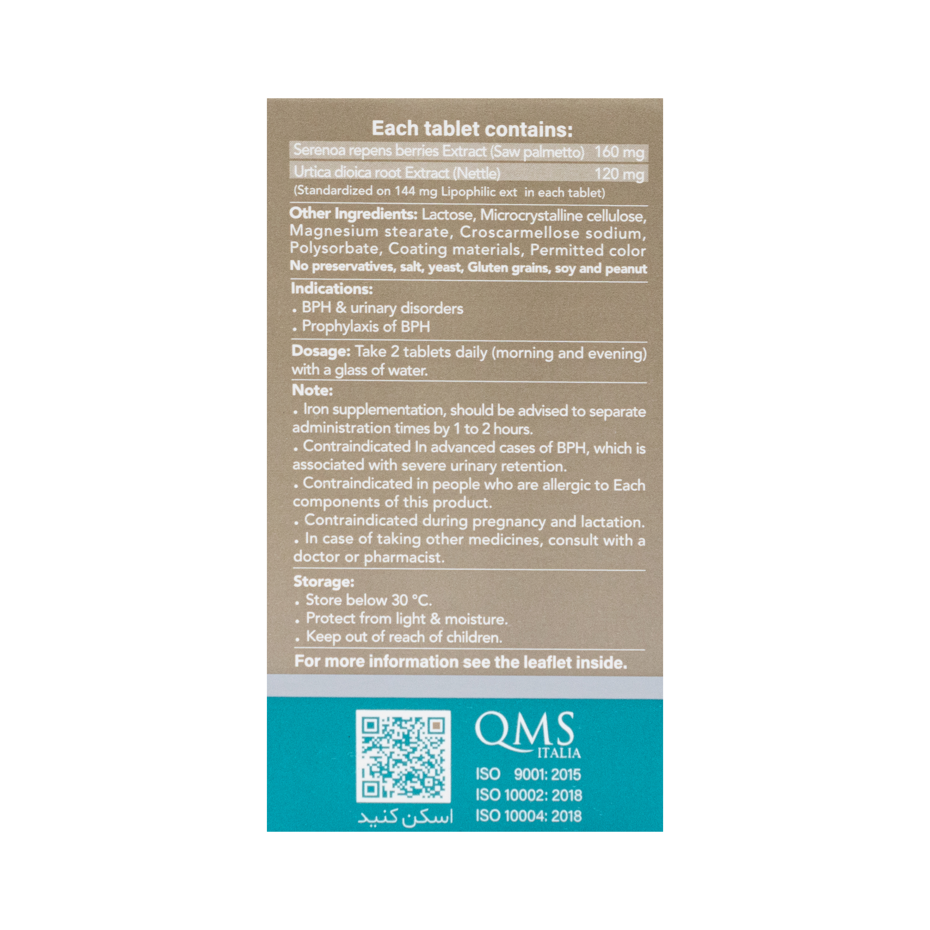 - ۱۲۰ میلی گرم عصاره استاندارد ریشه گزنه (Stinging Nettle) و ۱۶۰ میلی گرم عصاره استاندارد میوه نخل اره ای (Saw Palmetto) با ۹۰ درصد مواد لیپوفیل (شامل اسیدهای چرب و استرول ها) می باشد.