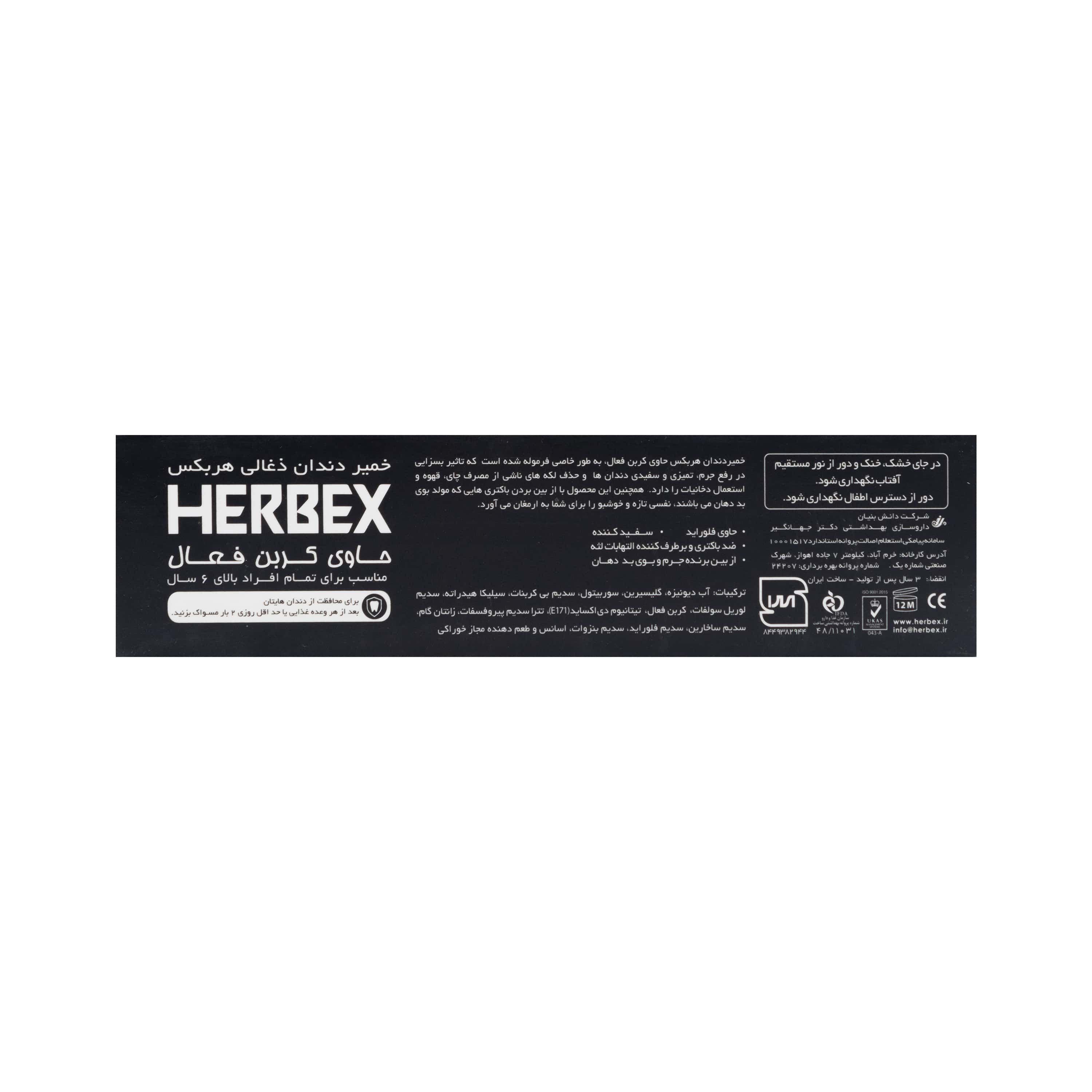 خمیردندان هربکس حاوی کربن فعال، به طور خاصی فرموله شده است که تاثیر بسزایی در رفع جرم، تمیزی و سفیدی دندان ها و حذف لکه های ناشی از مصرف چای، قهوه و استعمال دخانیات را دارد.