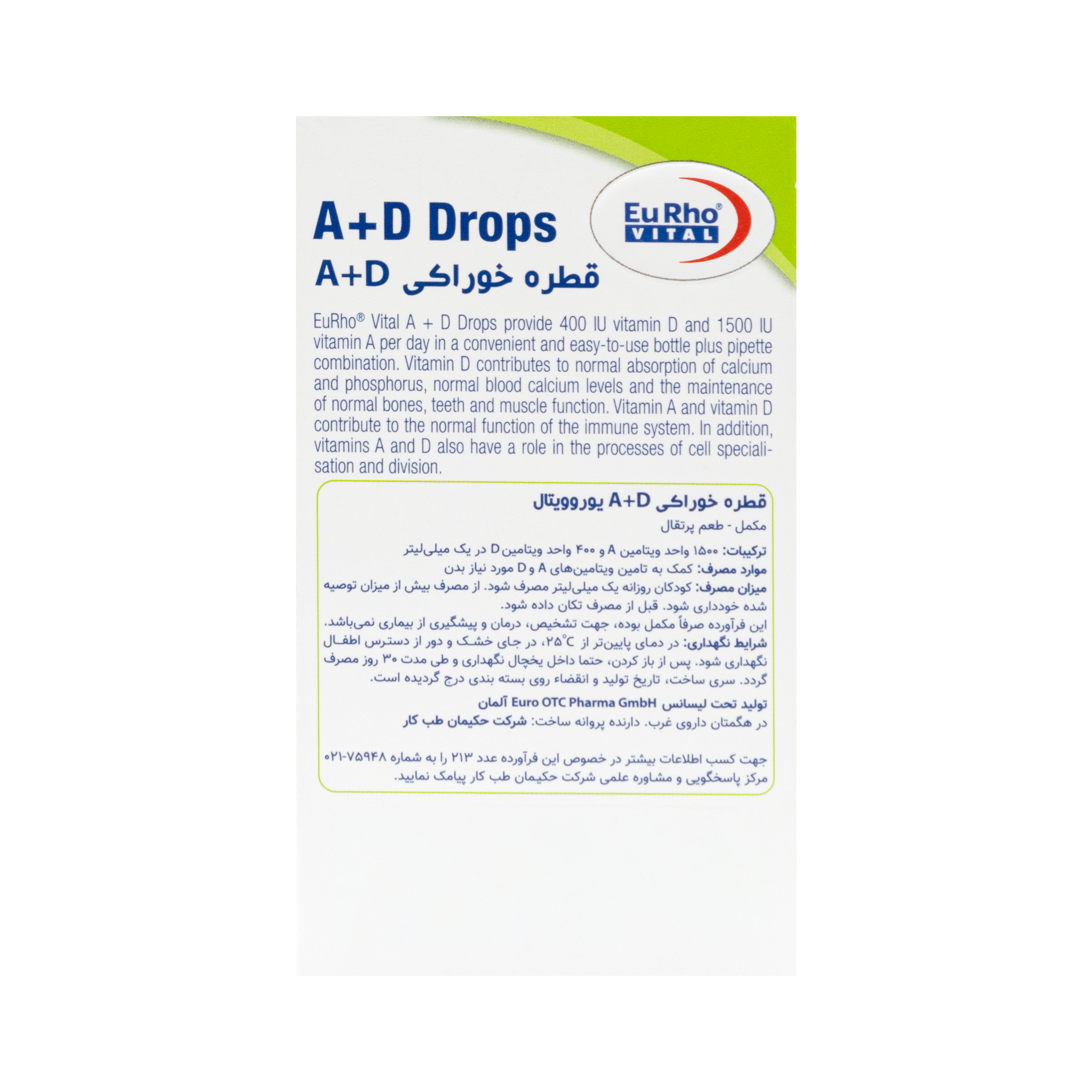 - مکمل غذایی حاوی ویتامین های A و D دارای 1500 واحد ویتامین A و 600 واحد ویتامین D در یک میلی لیتر