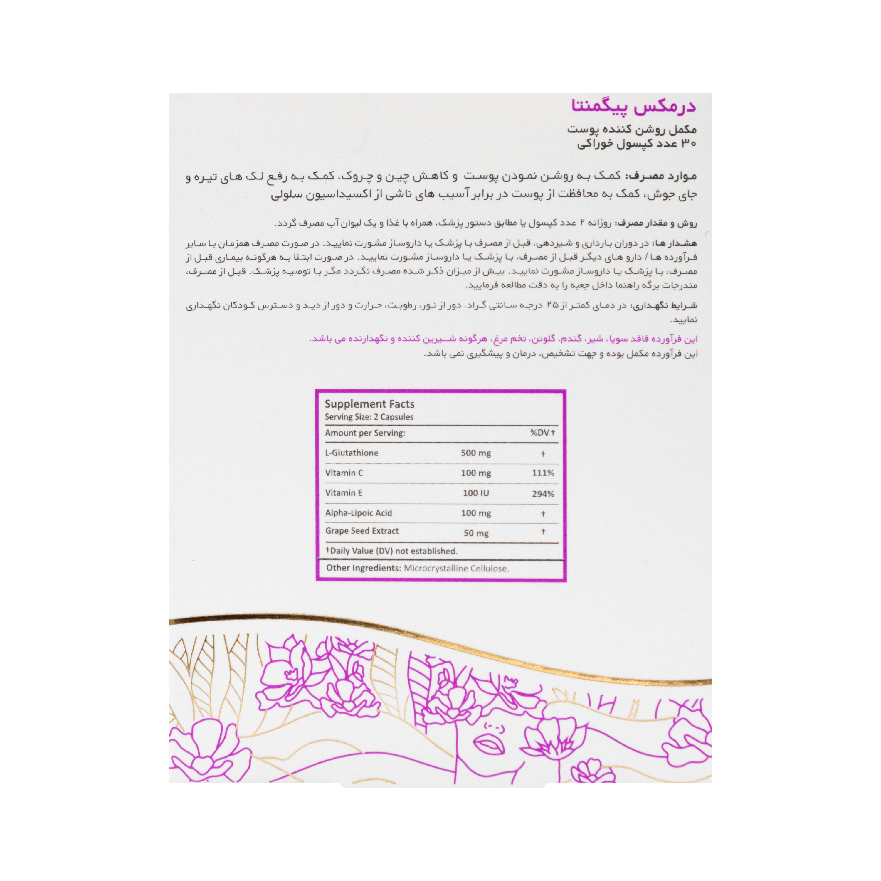 کپسول Pigmenta Dermax یک محصول روشن کننده بوده که به سلامت پوست کمک میکند. این قرص حاوی چندین آنتی اکسیدان قوی است که از فرآیند پیری زودرس پوست و بروز چین و چروک در آن جلوگیری میکند. قرص پیگمنتا حاوی گلوتاتیون، آلفا لیپوئیک اسید، عصاره هسته انگور، ویتامین C و ویتامین E است که این ترکیبات با مکانیسمهای مختلف، روشن شدن پوست، رفع لکه های تیره و در نهایت سلامت و زیبایی بیشتر پوست را برای شما به ارمغان میآورد.