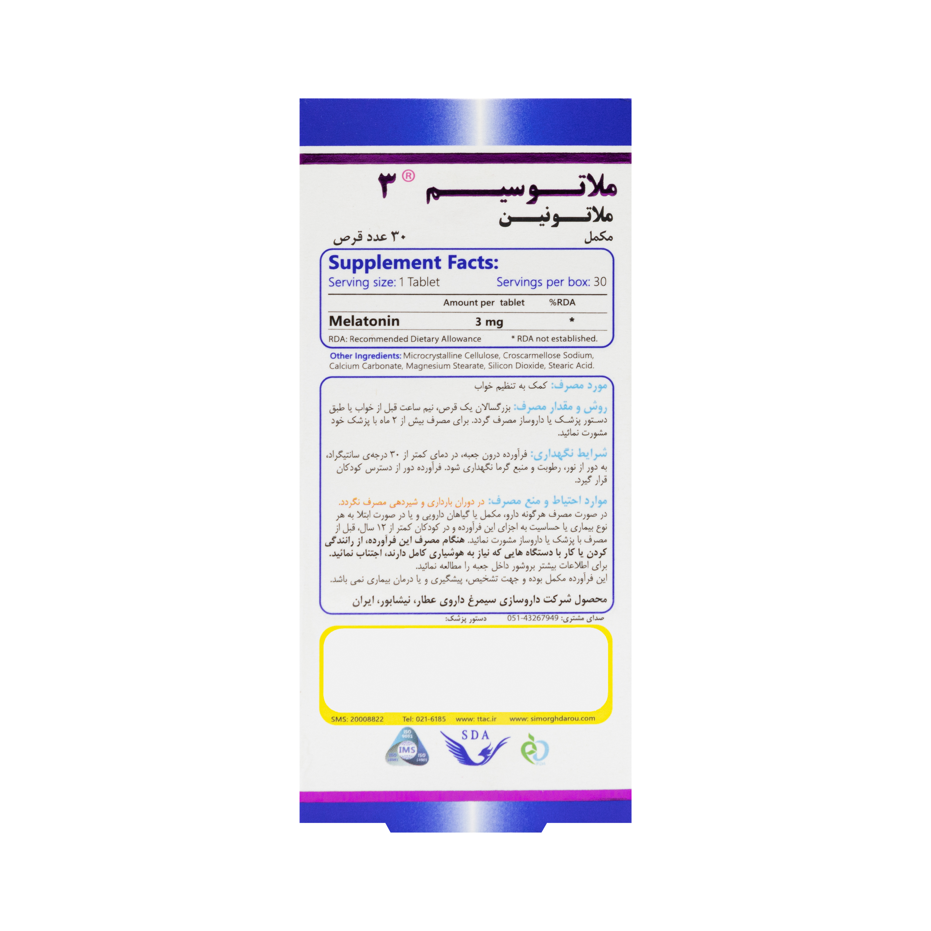 قرص ملاتونین 3 میلی گرم ملاتوسیم 30 عددی سیمرغ
