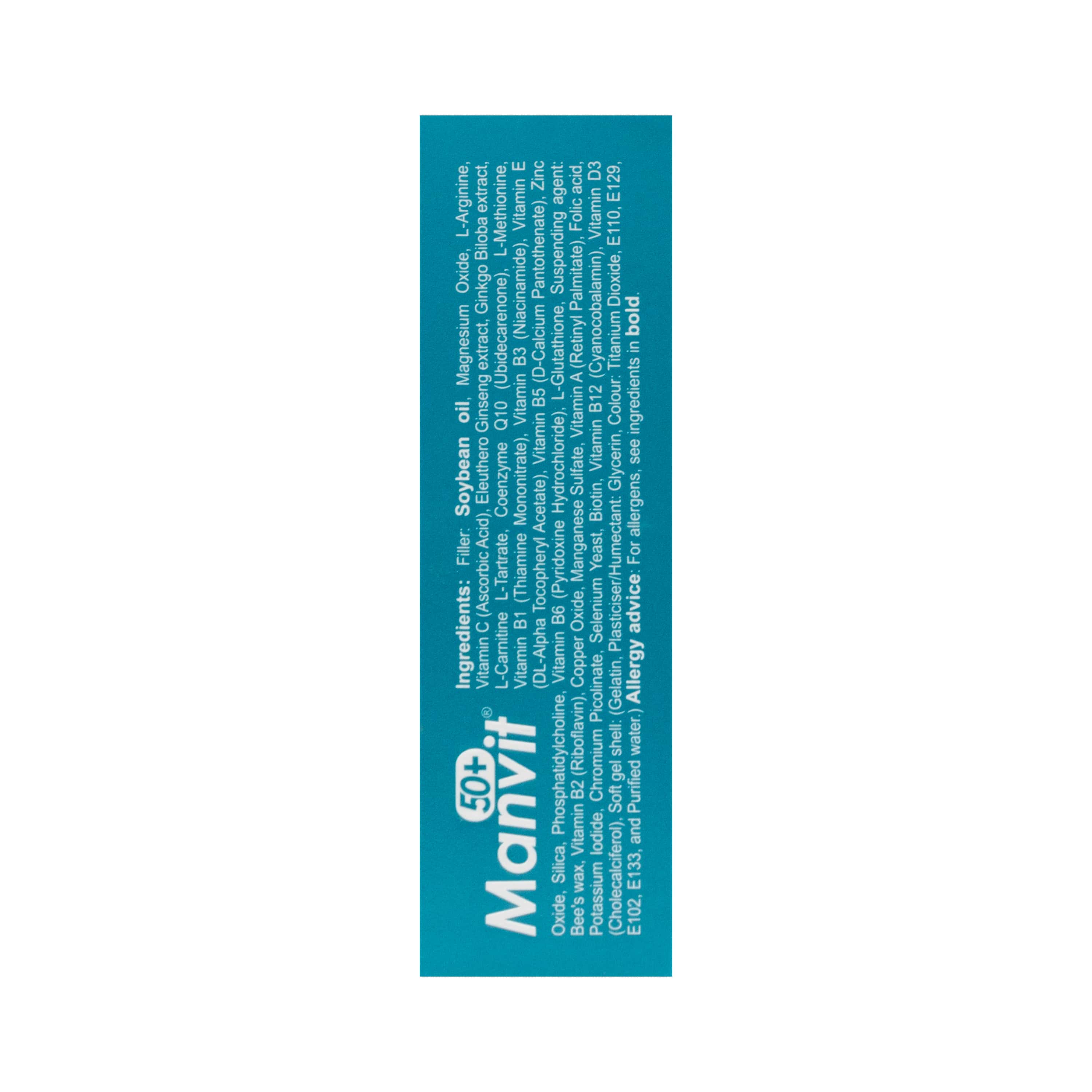 Ingredients: Filler: Soybean oil, Magnesium Oxide, L-Arginine, Vitamin C (Ascorbic Acid), Eleuthero Ginseng extract, Ginkgo Biloba extract, L-Carnitine L-Tartrate, Coenzyme Q10 (Ubidecarenone), L-Methionine, Vitamin B1 (Thiamine Mononitrate), Vitamin B3 (Niacinamide), Vitamin E (DL-Alpha Tocopheryl Acetate), Vitamin B5 (D-Calcium Pantothenate), Zinc Oxide, Silica, Phosphatidylcholine, Vitamin B6 (Pyridoxine Hydrochloride), L-Glutathione, Suspending agent: Bee's wax, Vitamin B2 (Riboflavin), Copper Oxide, Manganese Sulfate, Vitamin A (Retinyl Palmitate), Folic acid, Potassium lodide, Chromium Picolinate, Selenium Yeast, Biotin, Vitamin B12 (Cyanocobalamin), Vitamin D3 (Cholecalciferol), Soft gel shell: (Gelatin, Plasticiser/Humectant: Glycerin, Colour: Titanium Dioxide, E110, E129, E102, E133, and Purified water.)
