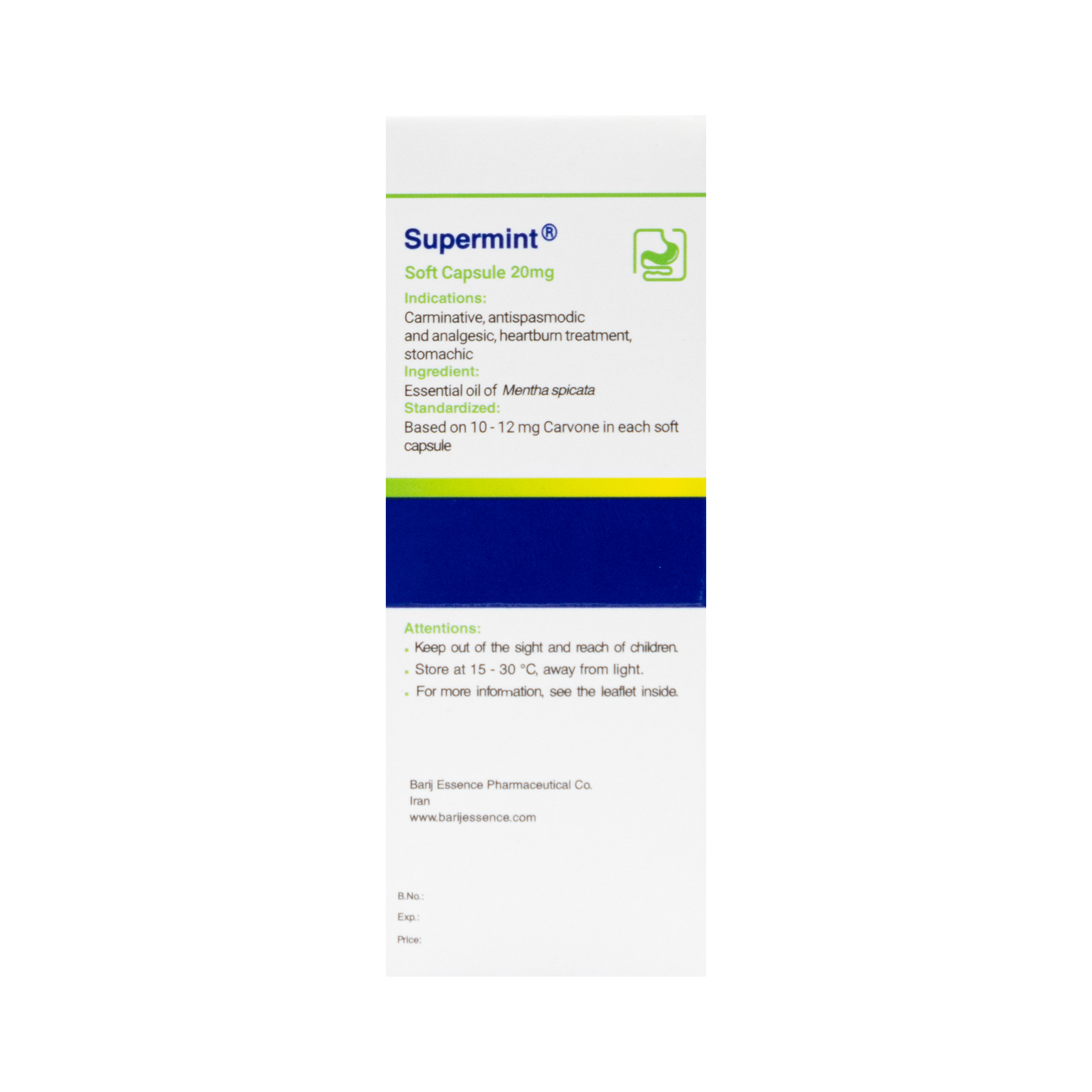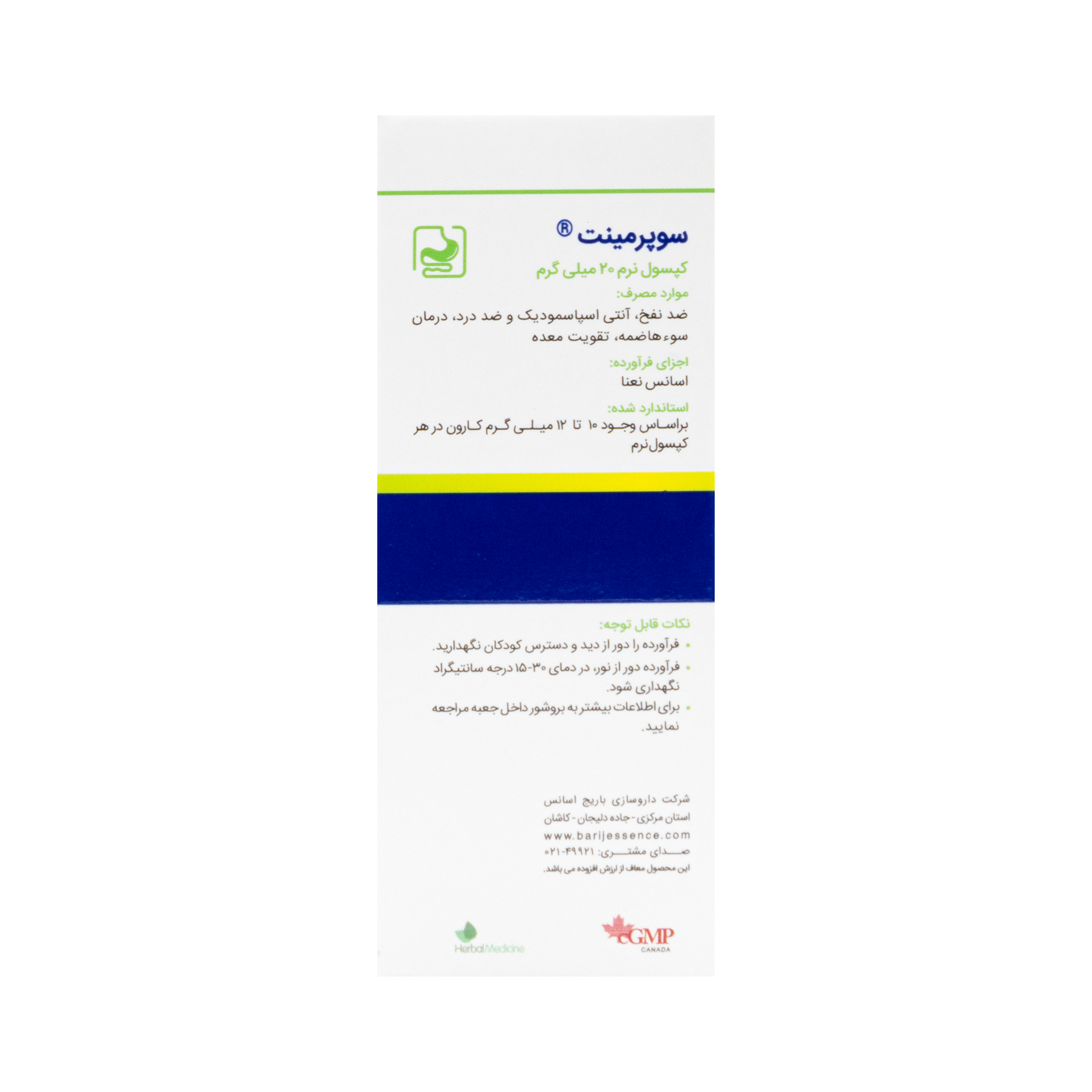 این قرص محصولی از شرکت داروسازی باریج اسانس است که یک برند معتبر در تولید فرآوردههای دارویی گیاهی میباشد. این شرکت کپسول سوپرمینت باریج را به دو شکل قوطی و ورقهای بسته بندی کرده است که هر دو حاوی 30 عدد کپسول نرم (پرل) 20 میلیگرمی میباشند.