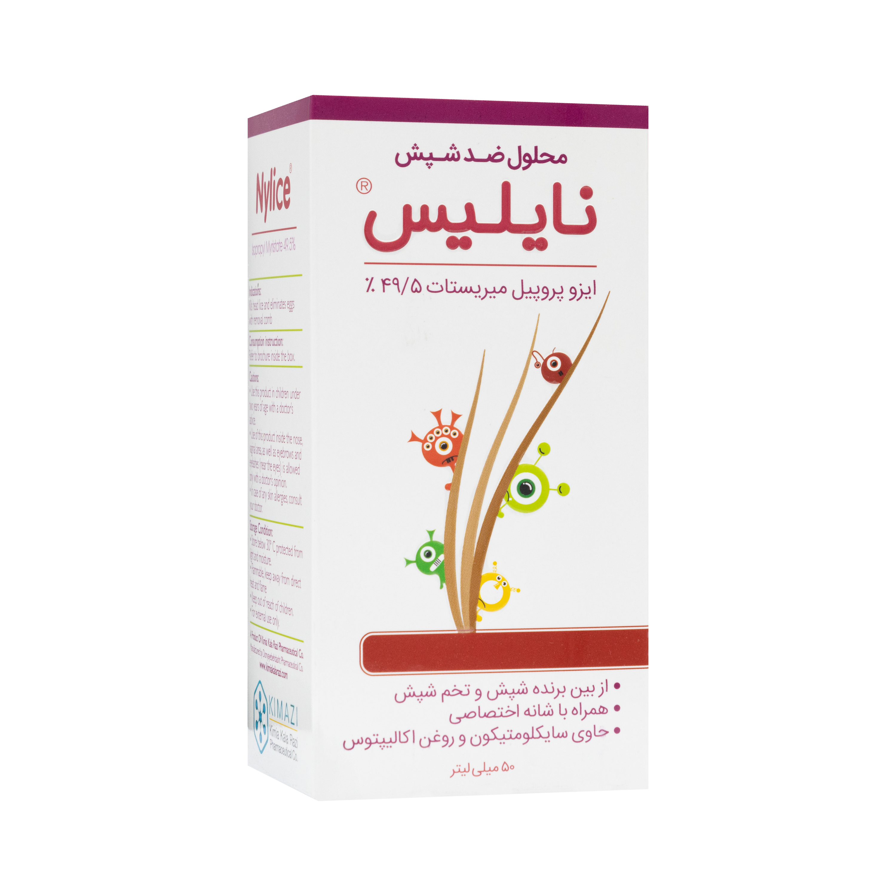 محلول ضد شپش نایلیس محصولی از شرکت کیمیا کالای رازی است که در لابراتوراهای دنیای بهشت تولید میگردد. هر جعبه این محصول حاوی محلول 50 میلیلیتری نایلیس به همراه شانه مخصوص و برگه راهنمای مصرف میباشد.