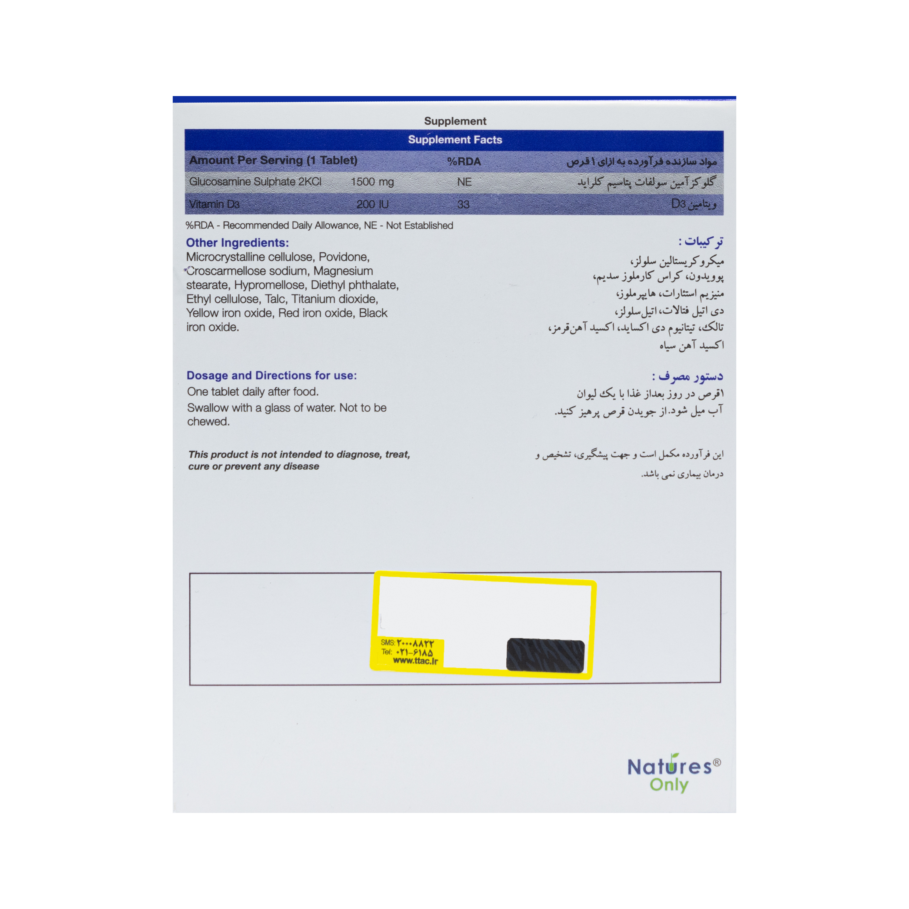 - گلوکزامین سولفات پتاسیم کلراید معادل ۱۵۰۰ میلی گرم گلوکزامین سولفات، ۲۰۰ واحد بین المللی ویتامین D3 می باشد.