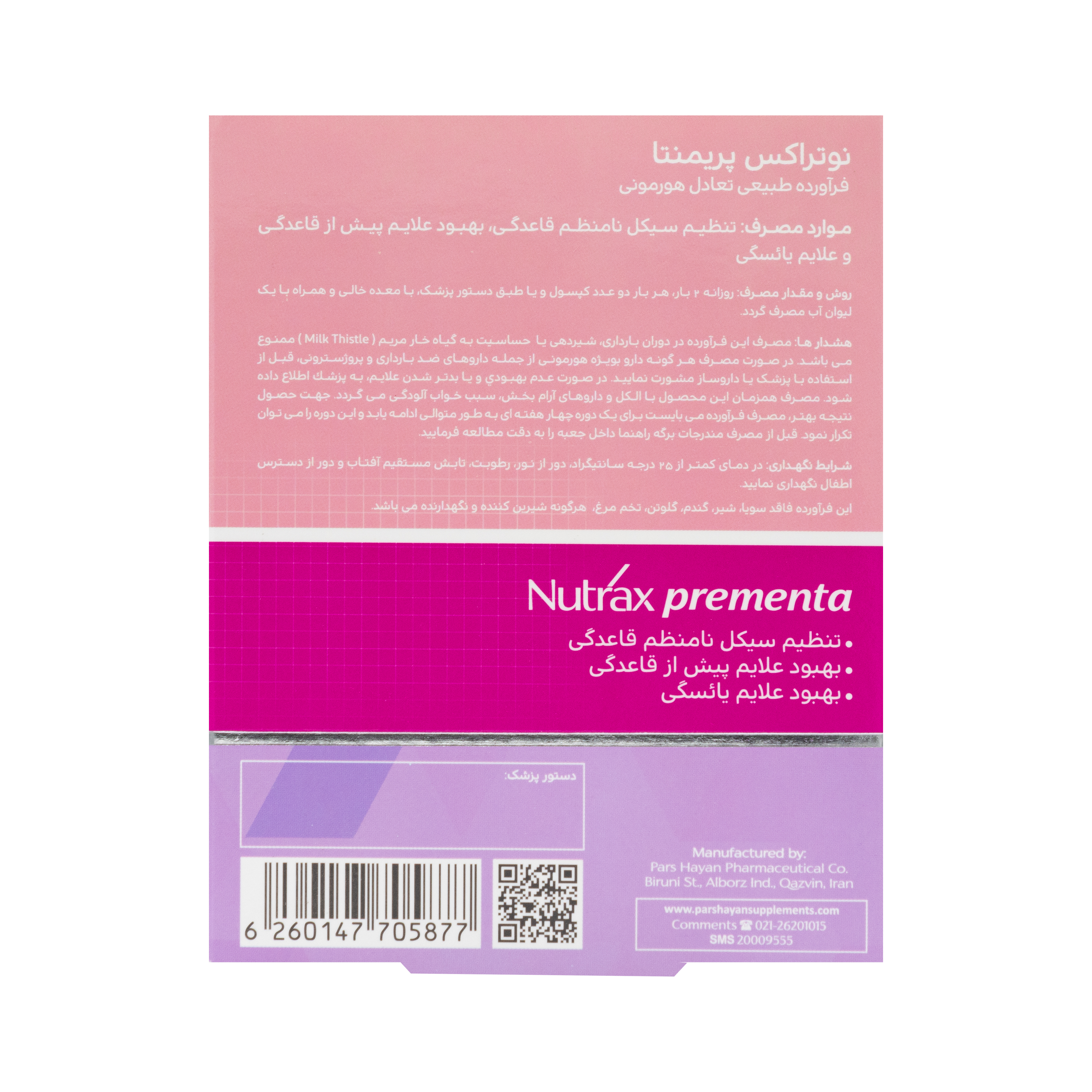 پریمنتا نوتراکس یک فرآورده طبیعی برگرفته از شش گیاه شناخته شده شامل نخل ارهای، پنج انگشت، خارمریم، قاشقک، تمشک قرمز و یام وحشی است. این قرص نقش بسزایی در تعادل هورمونی بانوان ایفا نموده و به تنظیم سیکل نامنظم قاعدگی، بهبود علائم پیش از قاعدگی و علائم یائسگی بانوان کمک شایانی مینماید.