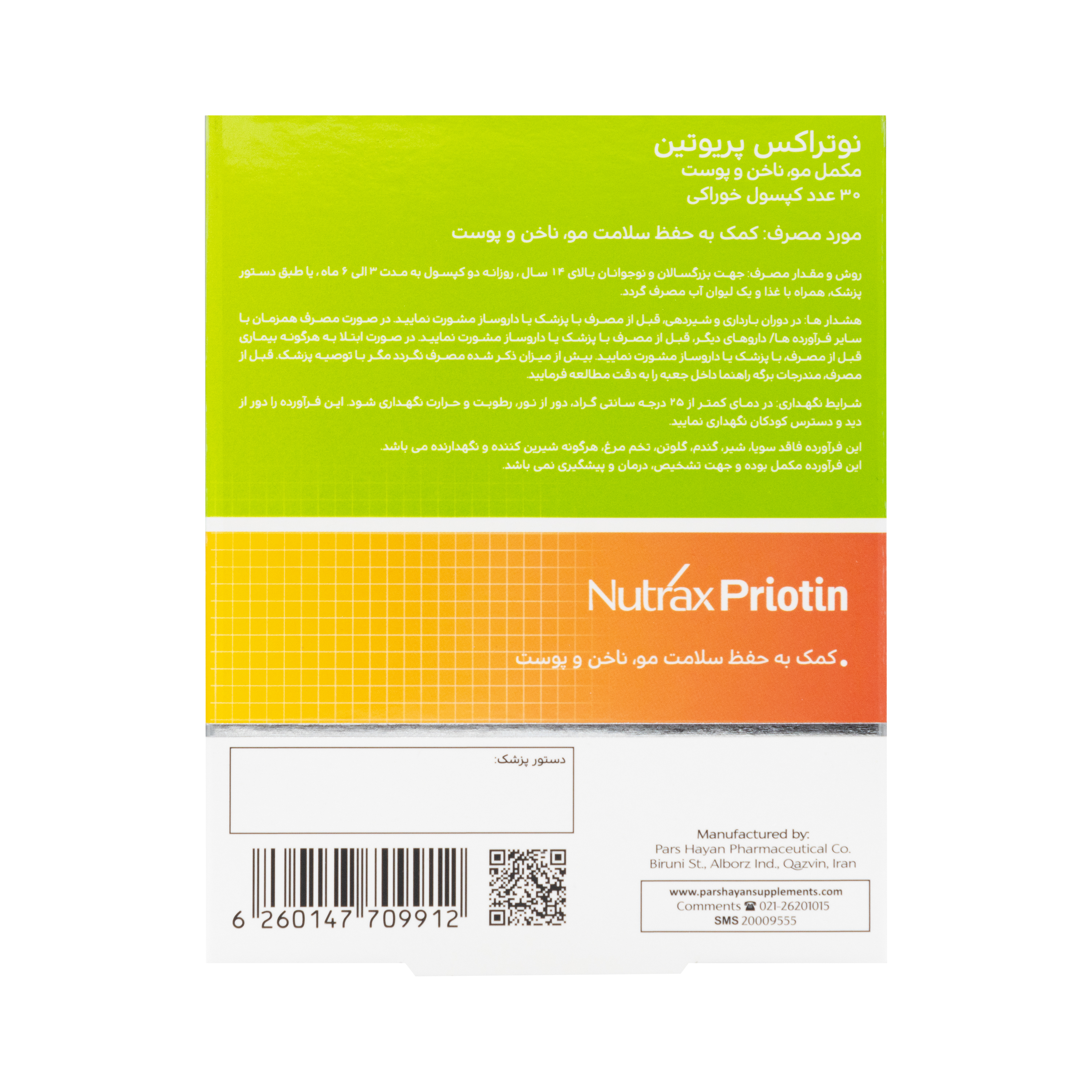 کپسول نوتراکس پریوتین یک مکمل تخصصی برای زیبایی و سلامت بدن است که بهصورت کپسولهای نرم و قابلبلع در بستهبندی ۳۰ عددی ارائه میشود. این مکمل تحت لیسانس برند آلمانی Nutrax تولید شده و بهصورت روزانه (دو عدد در روز) مصرف میشود. ترکیبات موجود در کپسول پریوتین نوتراکس با هدف تغذیه فولیکولهای مو، بهبود ساختار ناخن و حفظ شادابی پوست طراحی شدهاند. در بین کاربران، این محصول گاهی با عنوان قرص پریوتین مو یا قرص پریوتین خارجی نیز شناخته میشود، اما فرم دارویی اصلی آن کپسول است.