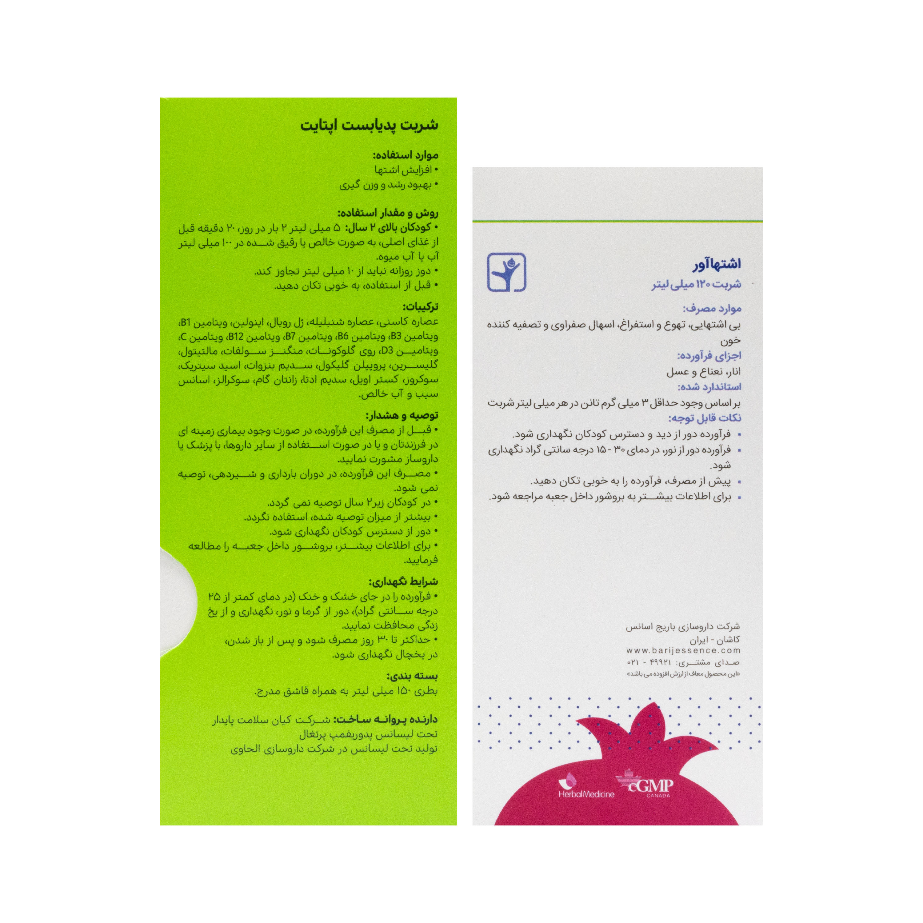 - شربت اشتها آور کودک باریج: انار، نعناع و عسل به همراه پتاسیم، منیزیم، فسفر، کلسیم، سدیم، ویتامین C، ویتامین B1، ویتامین B2، بتا کاروتن، فروکتوز، گلوکز، روغن ضروری- استاندارد شده براساس وجود حداقل ۳ میلیگرم تانن در هر میلیلیتر شربت