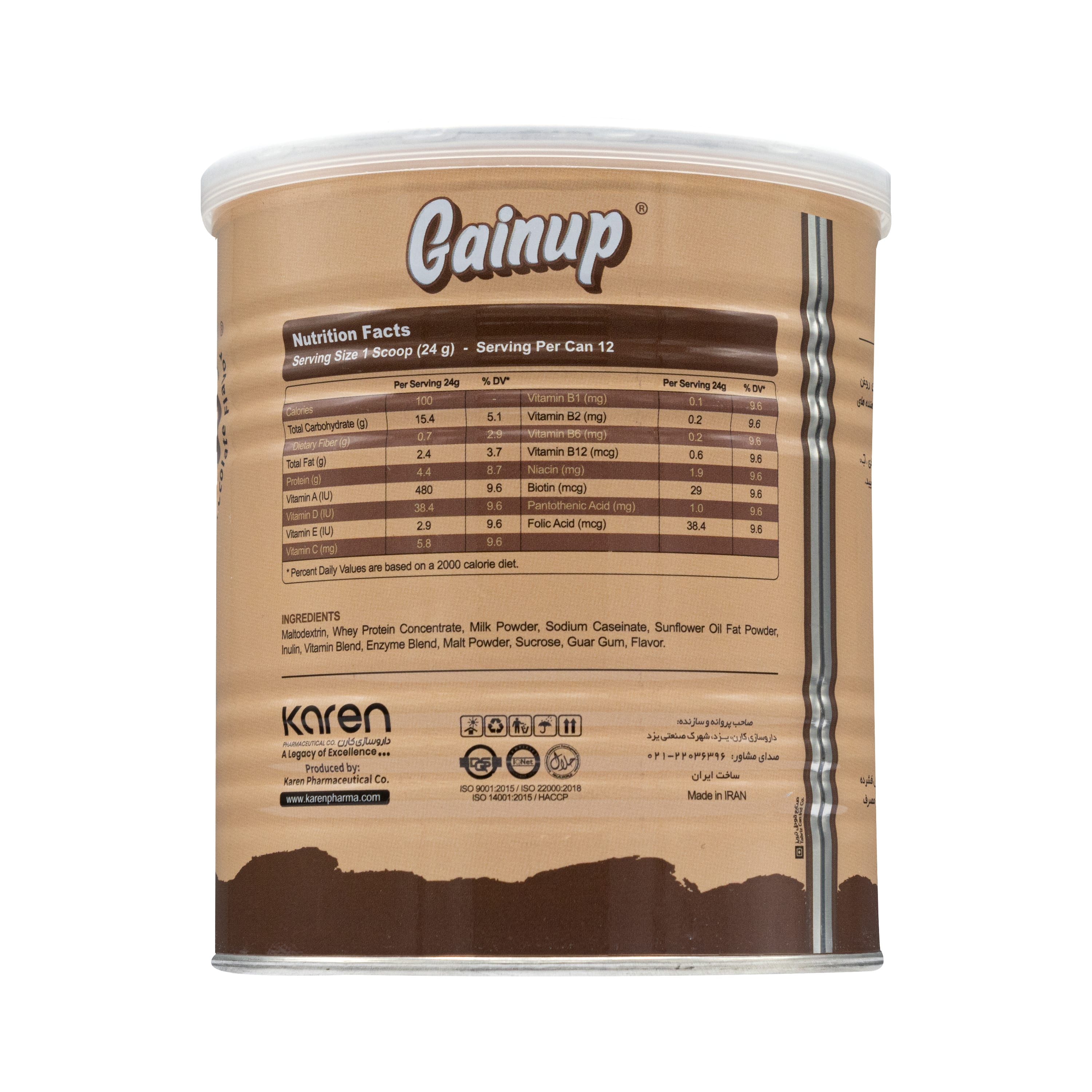 پودرهای گین آپ محصولی از صنایع داروسازی و مکملهای غذایی حیاتی کارن هستند که برای افزایش وزن بزرگسالان و کودکان در طعمهای مختلف تولید میشوند. مواد اولیه این مکملها از بهترین و معتبرترین شرکتهای اروپایی تامین میگردد. همچنین ترکیب ویتامینی موجود در آن از شرکت dsm سوئیس میباشد.