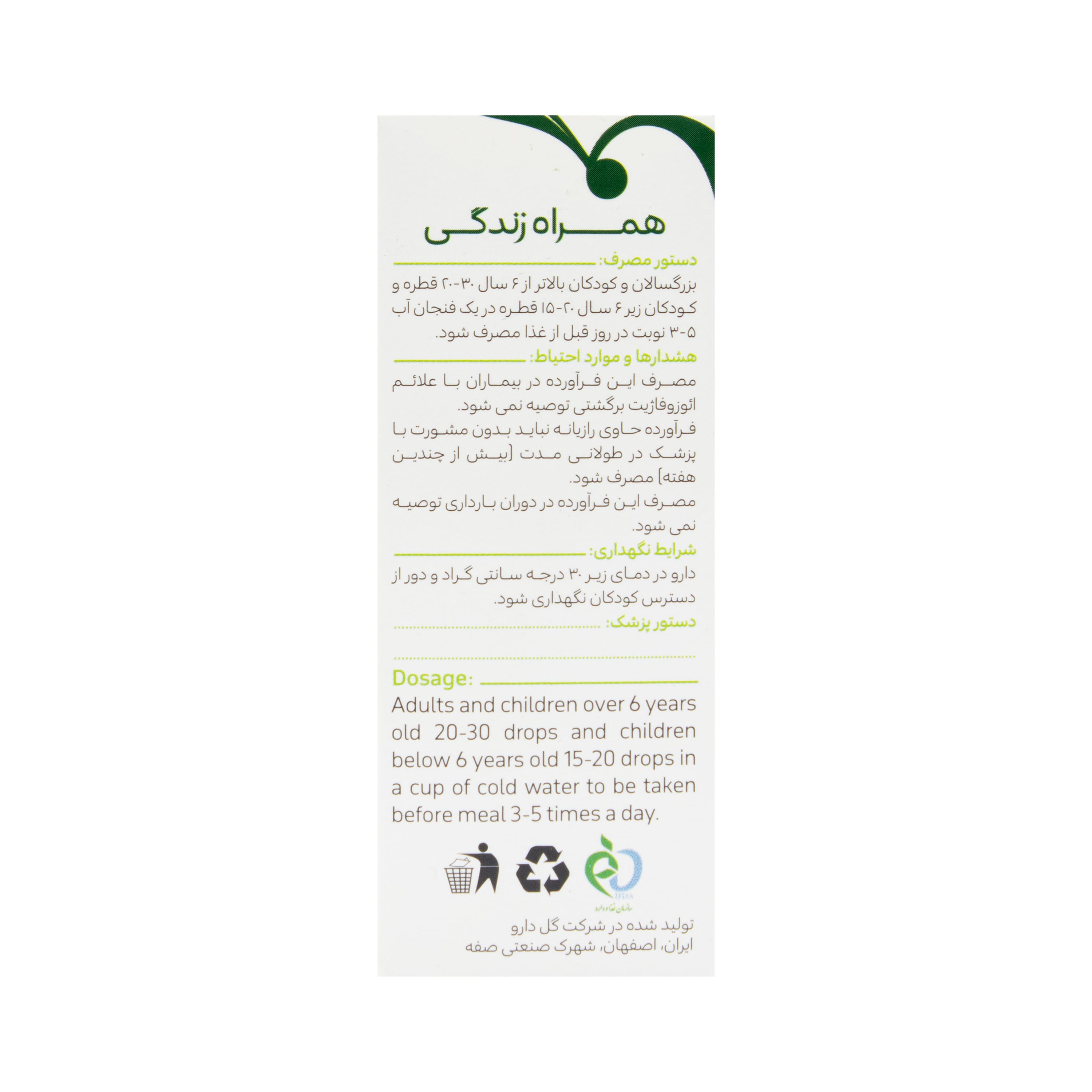 - کودکان زیر 6 سال 20-15: قطره همراه به کمی آب 5-3 نوبت در روز قبل از غذا مصرف شود.