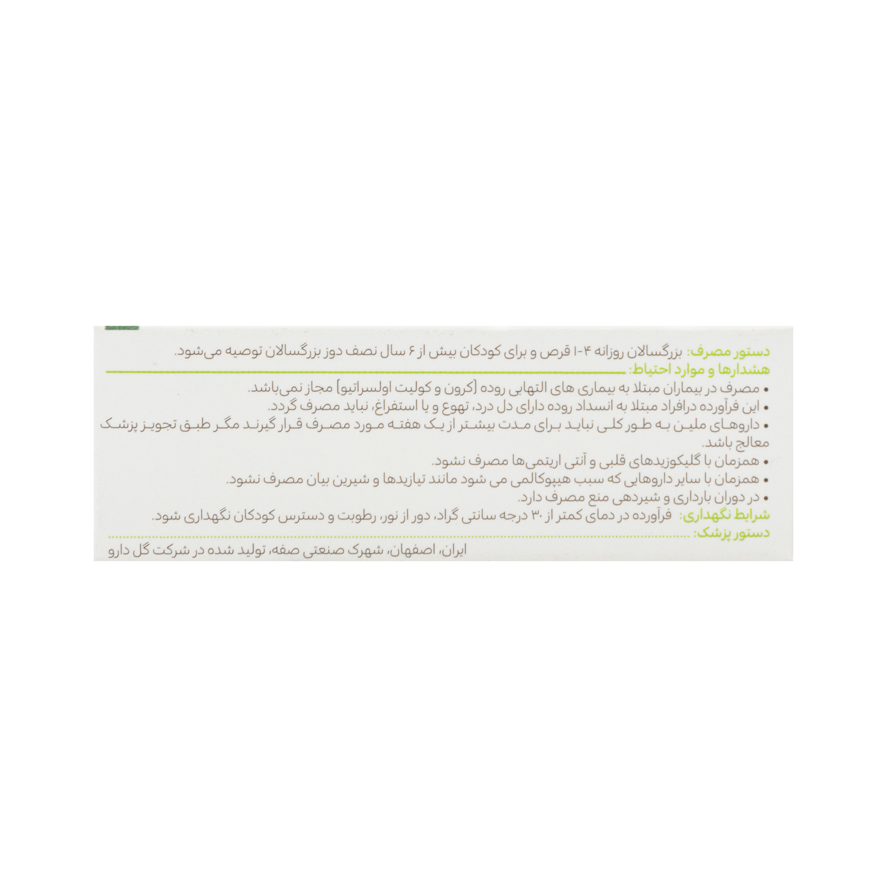 - مصرف در بیماران مبتلا به بیماری های التهابی روده (کرون و کولیت اولسراتیو) مجاز نمی باشد.
