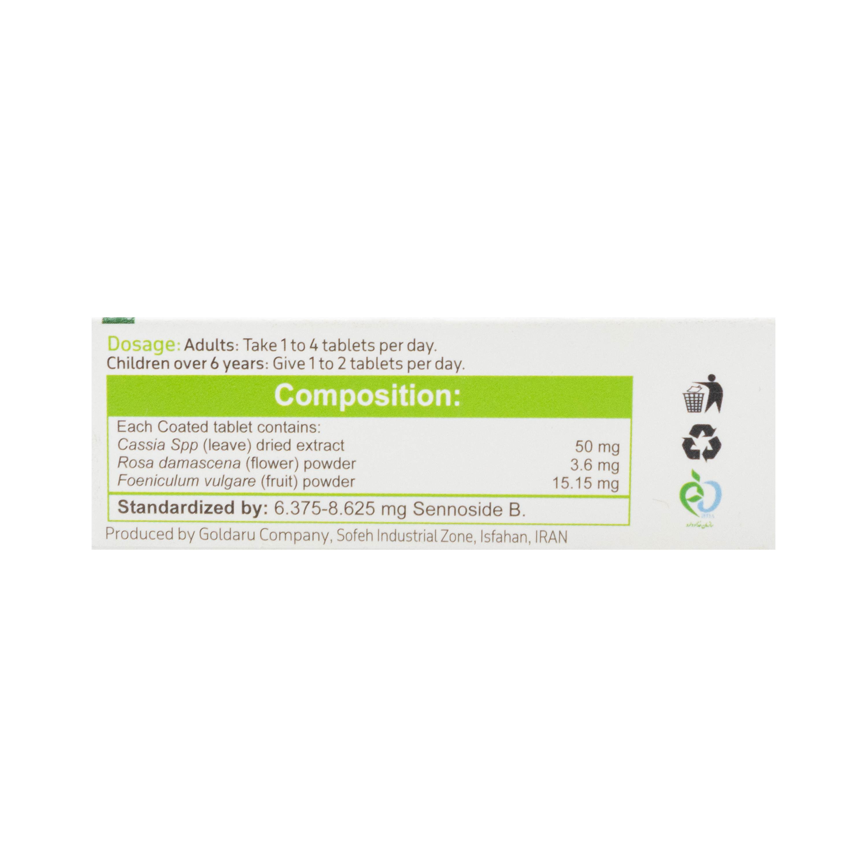 - 50 میلی گرم عصاره خشک برگ سنا (Cassia Spp) معادل 7.5 میلی گرم سنوزید B