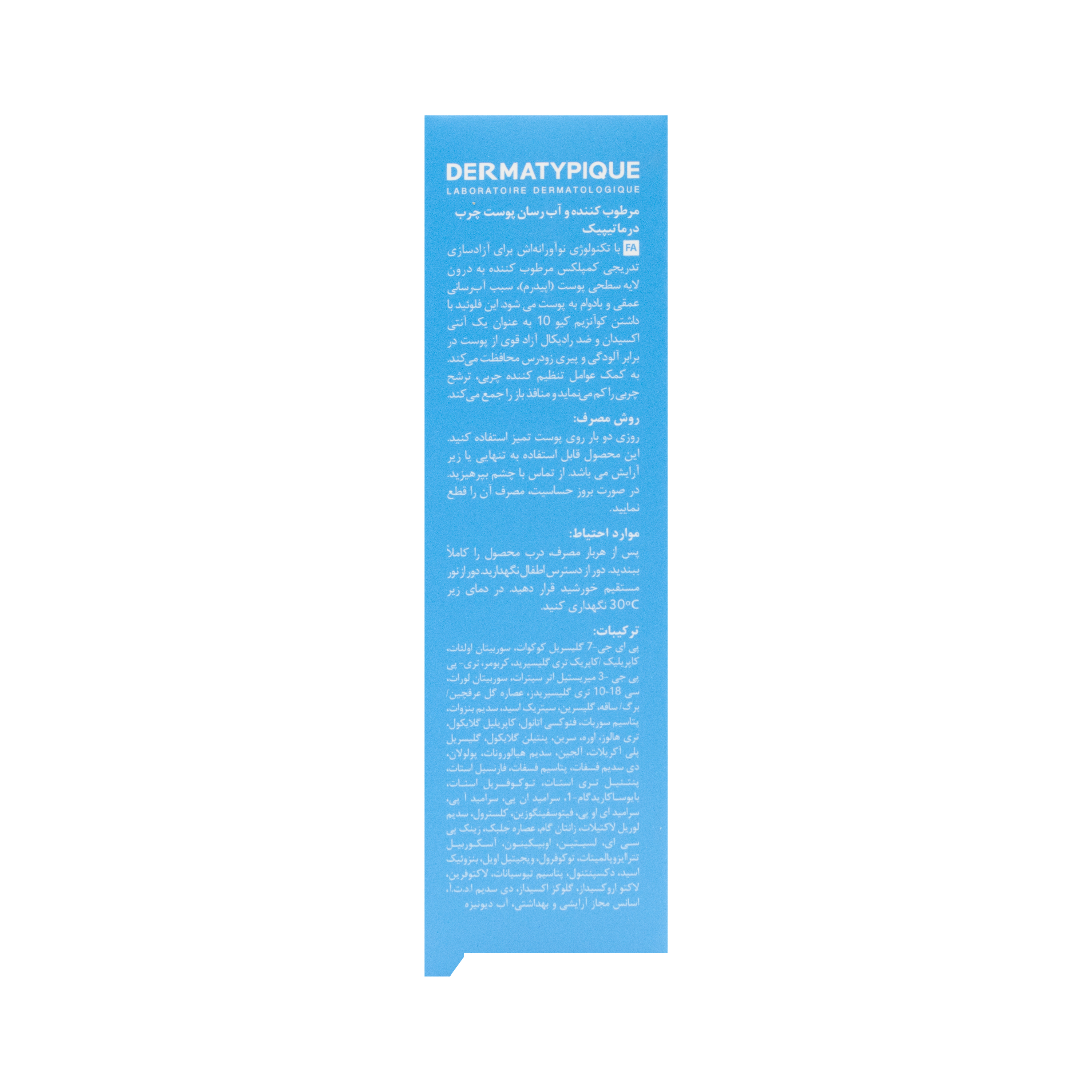 مرطوب کننده و آب رسان پوست چرب درماتیپیک با تکنولوژی نوآورانه اش برای آزادسازی تدریجی کمپلکس مرطوب کننده به درون لایه سطحی پوست (اپیدرم)، سبب آب رسانی عمقی و بادوام به پوست میشود این فلوئید با داشتن کوآنزیم کیو10 به عنوان یک آنتی اکسیدان و ضد رادیکال آزاد قوی از پوست در برابر آلودگی و پیری زودرس محافظت میکند. به کمک عوامل تنظیم کننده چربی، ترشح چربی را کم مینماید و منافذ باز را جمع میکند.