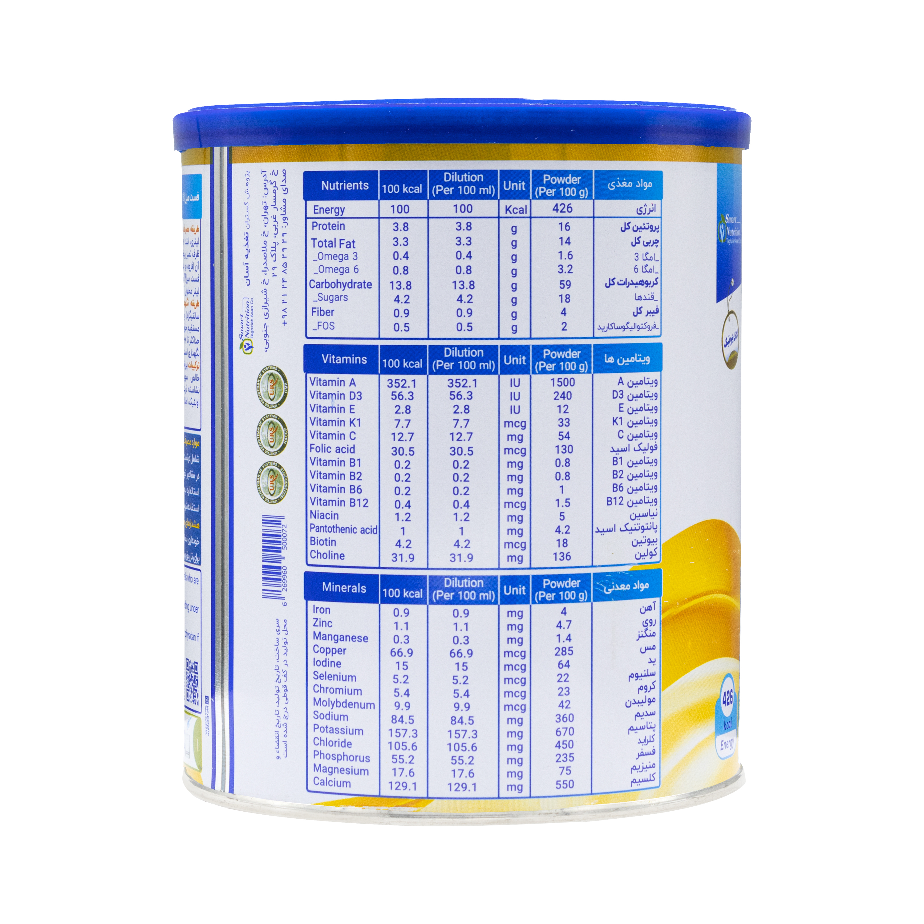 | مواد مغذی | Powder (Per100g) | Unit | Dilution (Per100ml) | 100kcal | Nutrition |