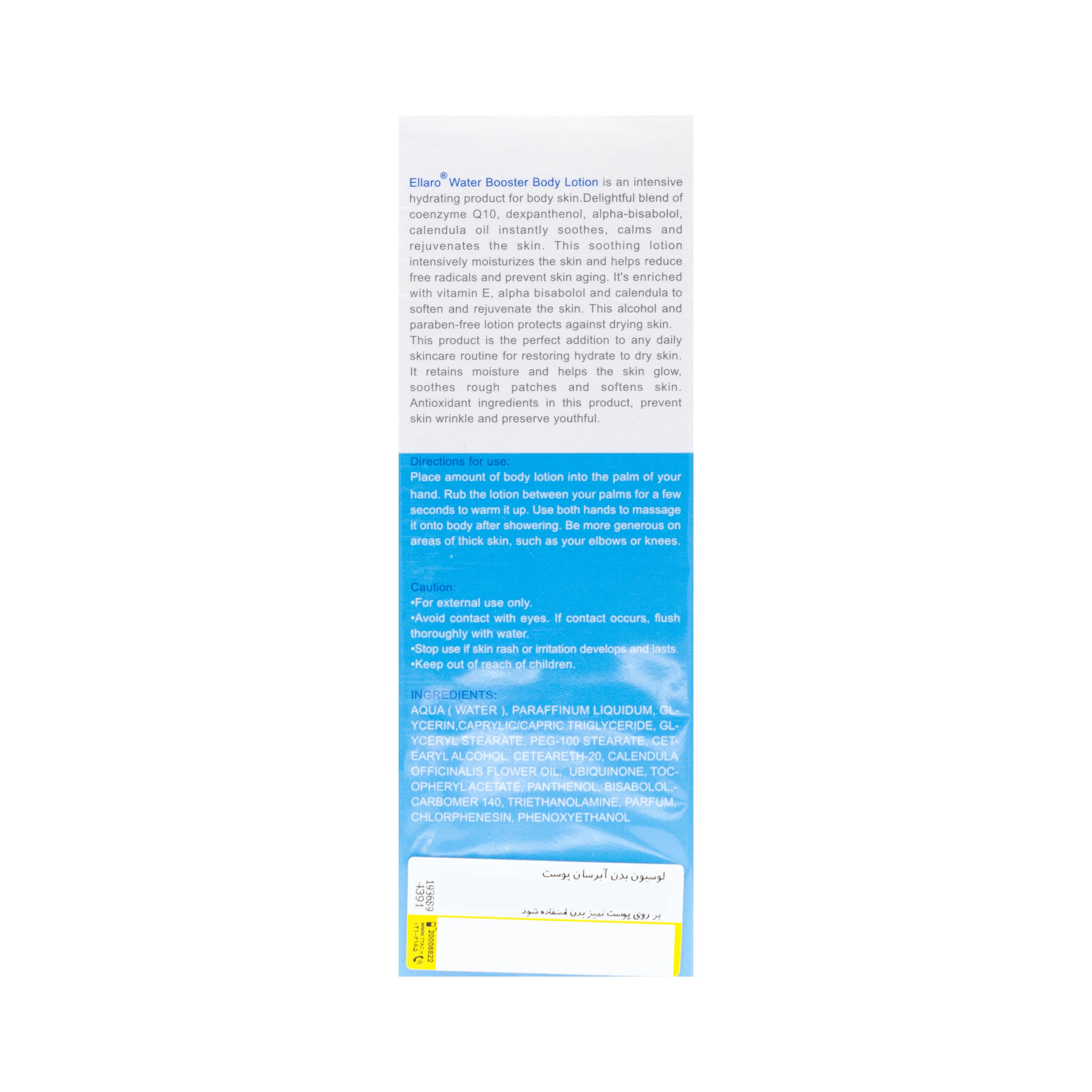 - لوسیون بدن آبرسان حاوی کوآنزیم کیوتن Q10 الارو همچنین سرشار از ویتامین E است که مرطوب کننده و محافظت کننده پوست بوده و آن را نرم و شاداب میکند.