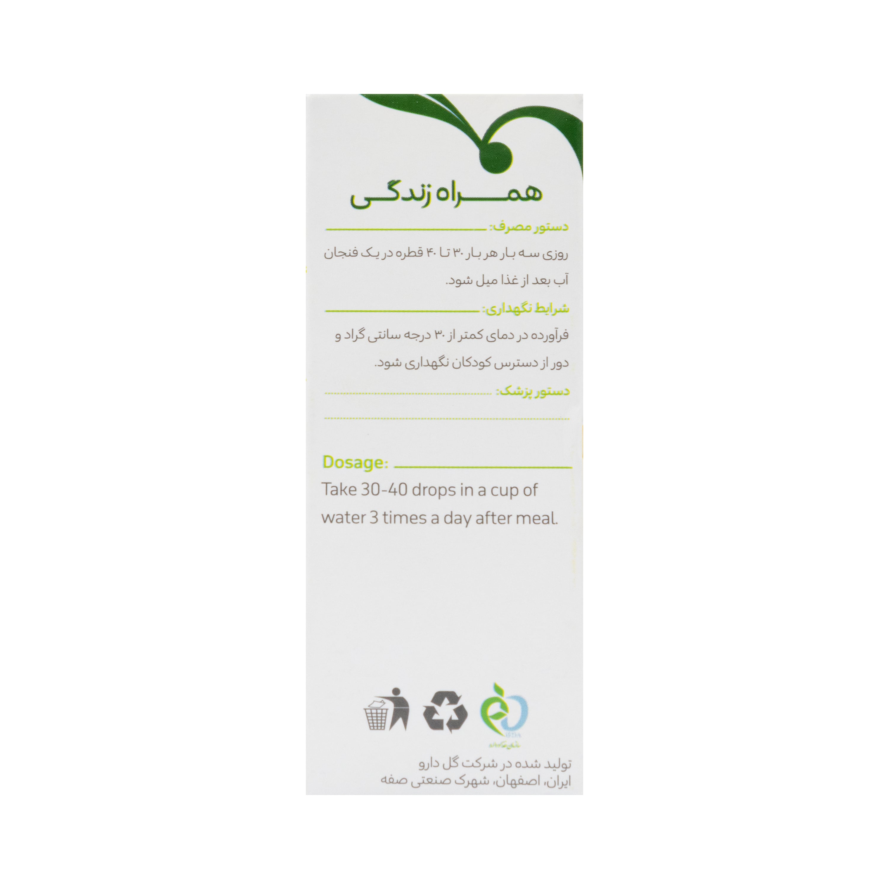 - روزی سه بار هر بار ۴۰- ۳۰ قطره در یک فنجان آب سرد با کمی قند بعد از غذا میل شود.