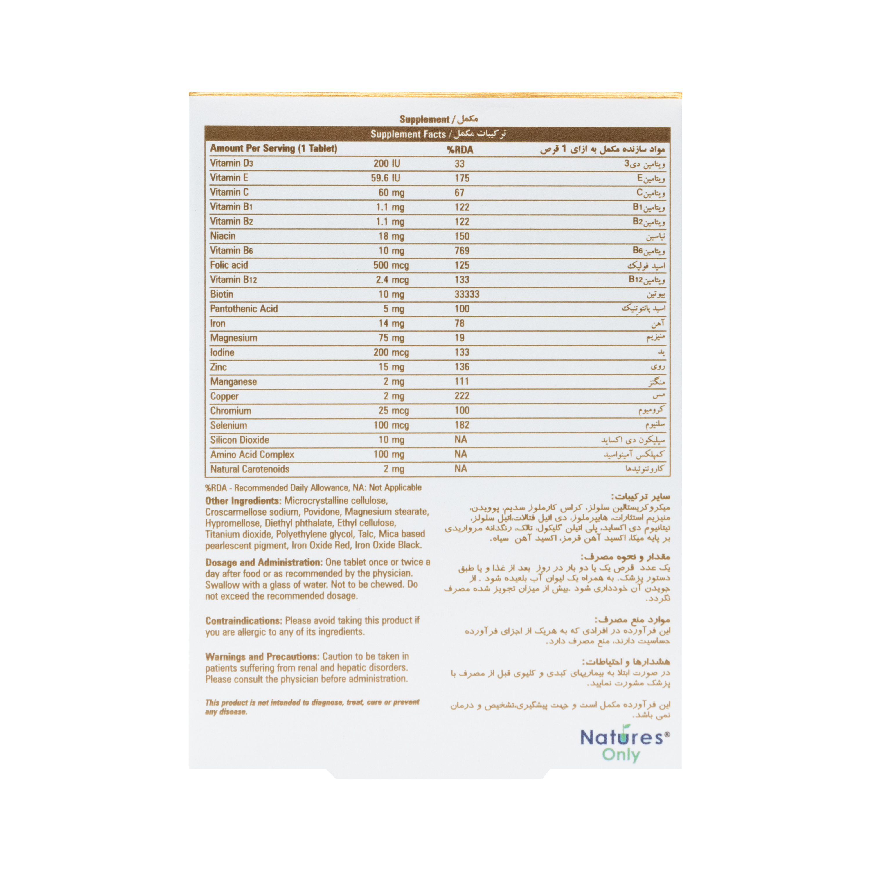 مواد سازنده مکمل غذایی به ازای یک قرص | RDA% | Amount Per Serving (1 Tablet) | |